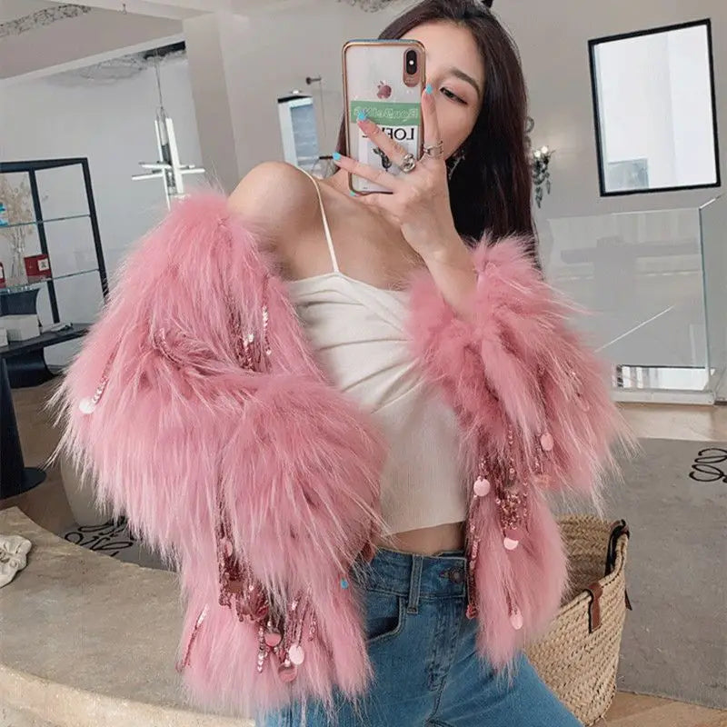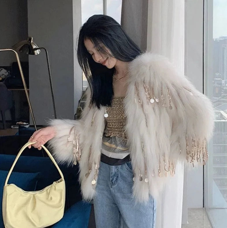 Elevate your winter wardrobe with our Women's Faux Fur Sequin Tassel Coat. This short, imitation raccoon fur jacket is a stunning choice for the festival season and the winter months.