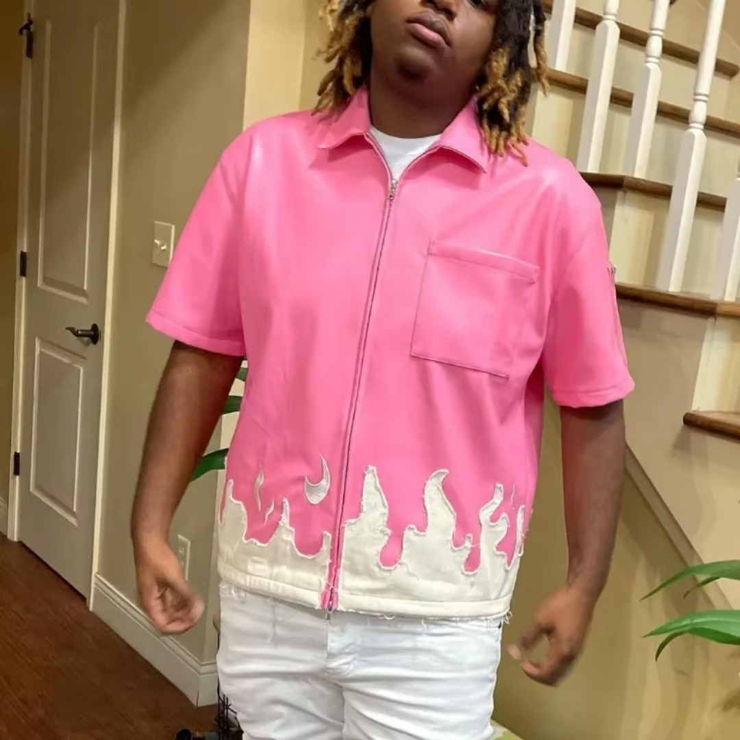 Keep your style fresh and unique with our Faux Leather Flame Shirts for men, inspired by the Y2K era. Made from a cotton and polyester blend, these shirts feature a faux leather texture, zipper closure, frayed hem, and white flames at the bottom for a distressed look. Available in classic black or bold orange with a large embroidered '69' number on the back, these festival-ready shirts are short sleeved with an O-neck, perfect for showing off your love for hip hop and Y2K fashion.
