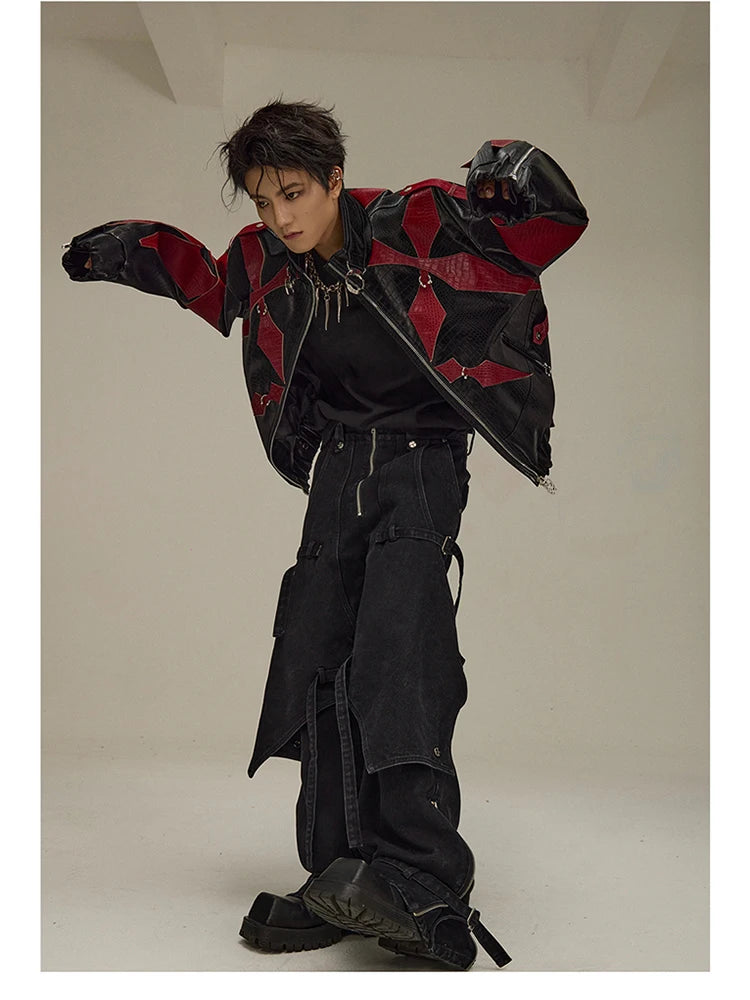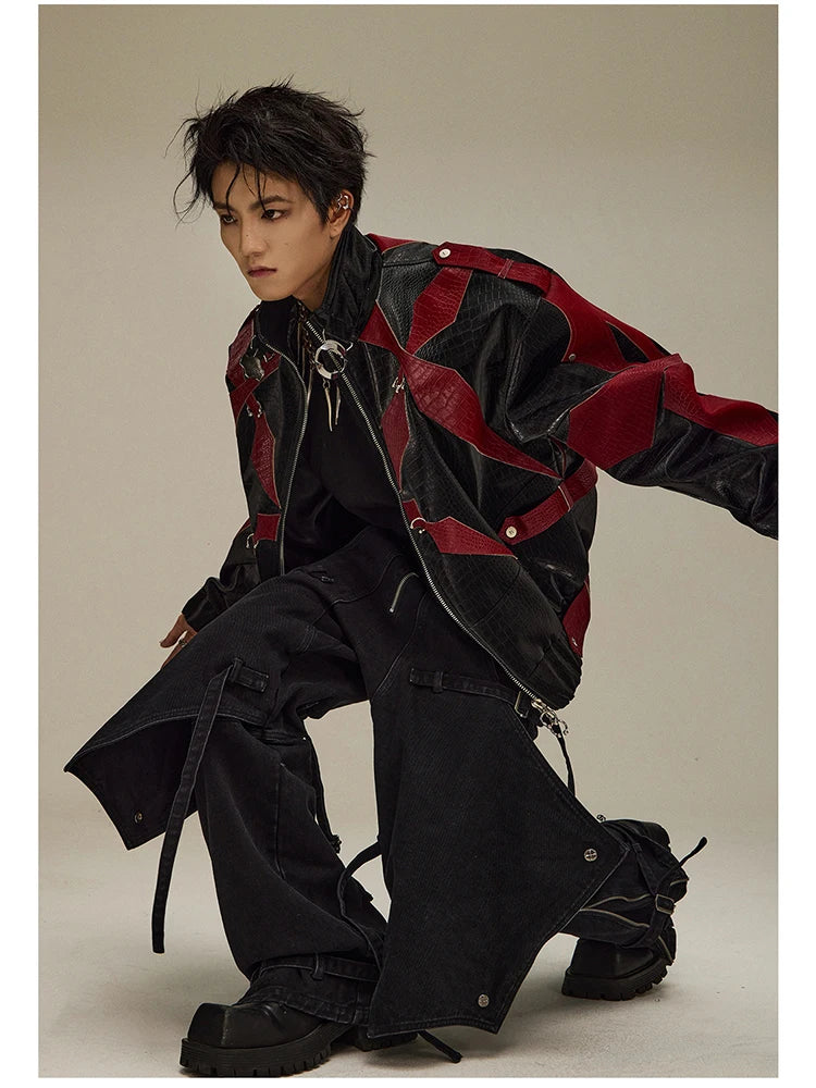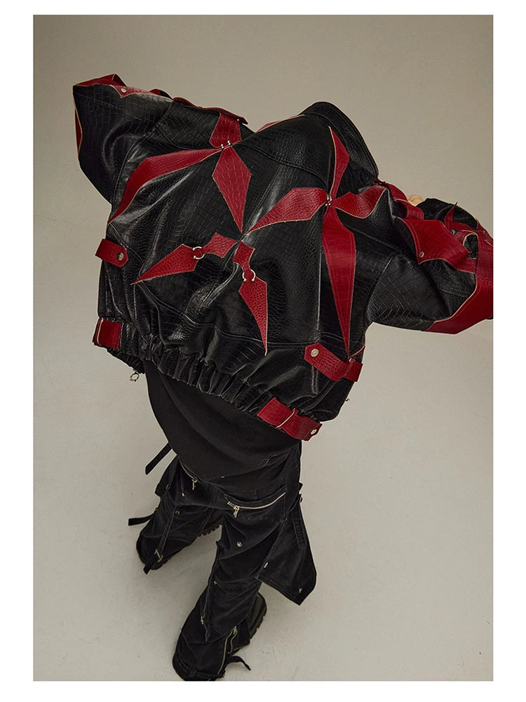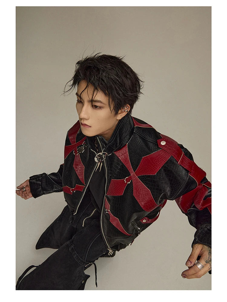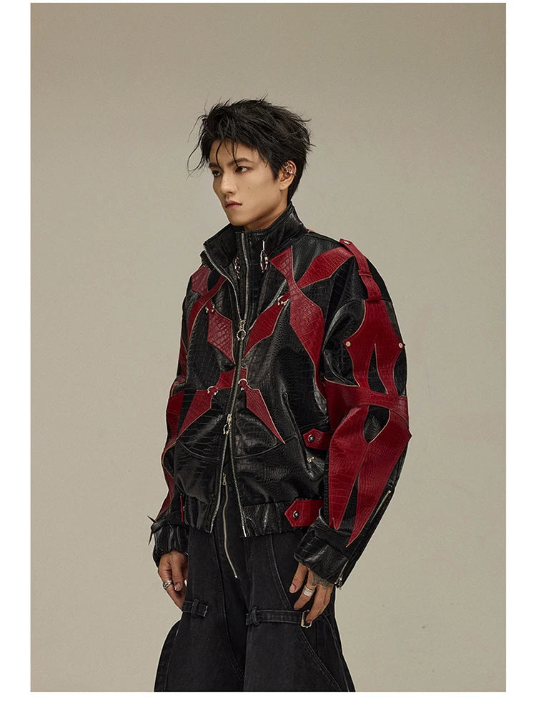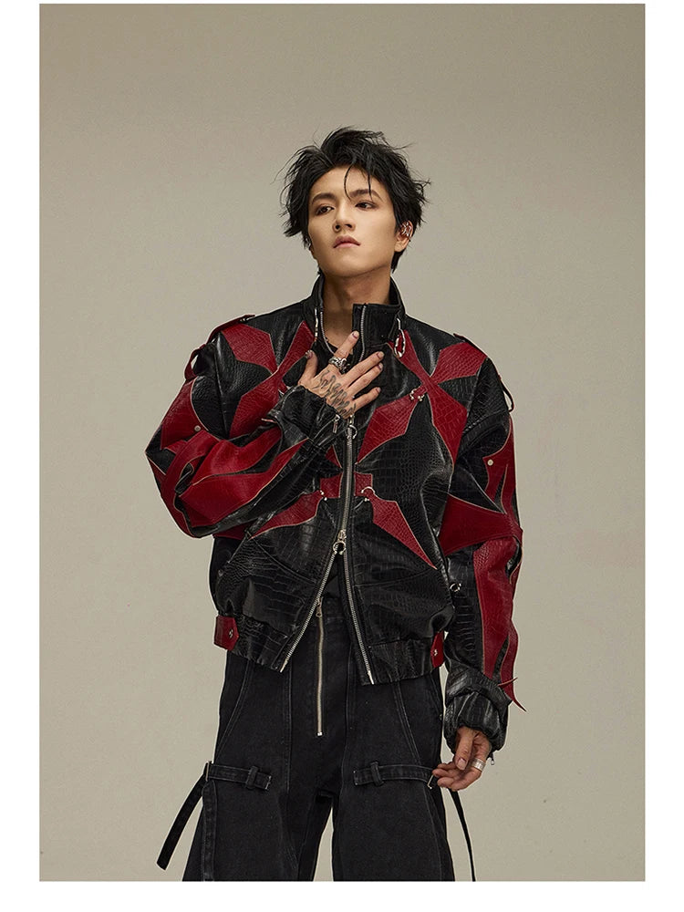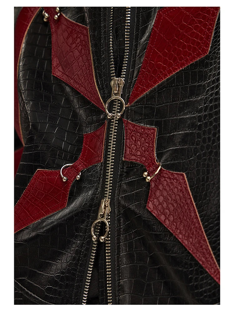 Turn heads like a future rockstar with this Men’s Crocodile Faux Leather Jacket. Made from high-quality faux crocodile leather, this black jacket features bold red cross appliqués and edgy septum-style rivets for a look that’s totally unique. The front zipper closes all the way up to form a cool turtle-neck style, while the ruched trim and sleeves add a punch of punk attitude.