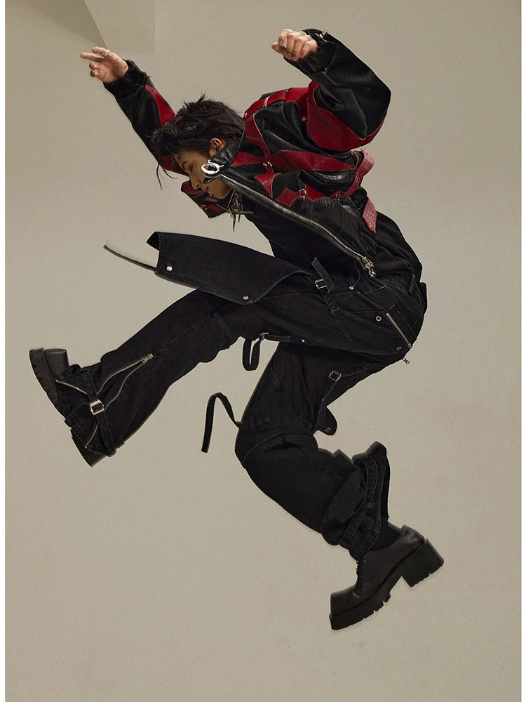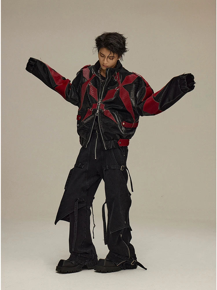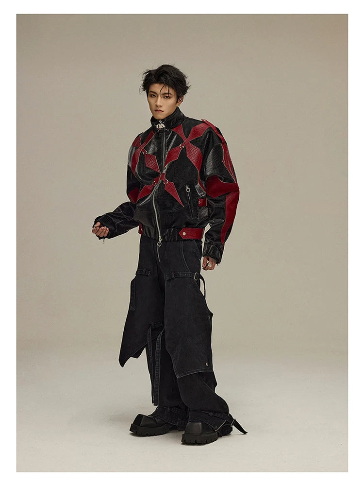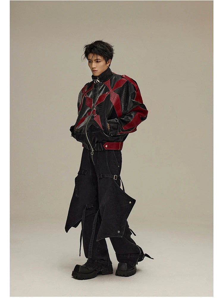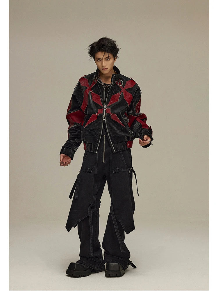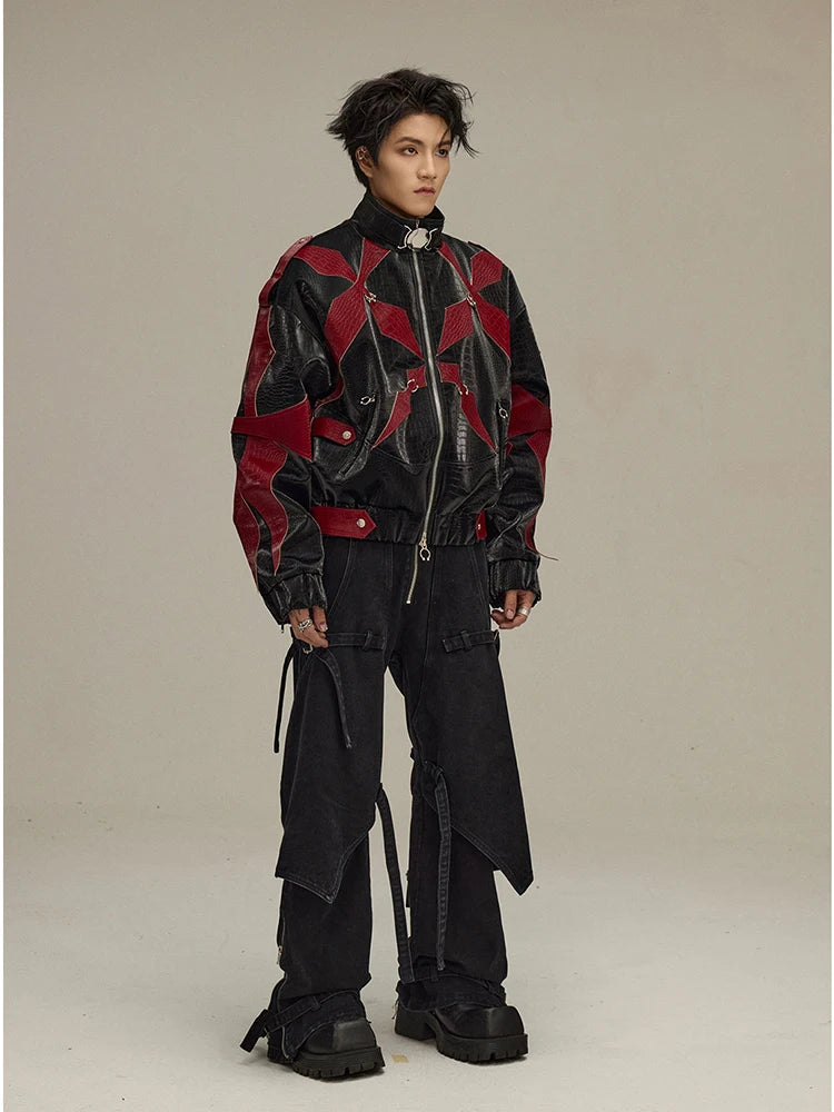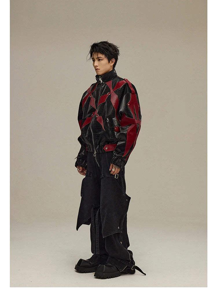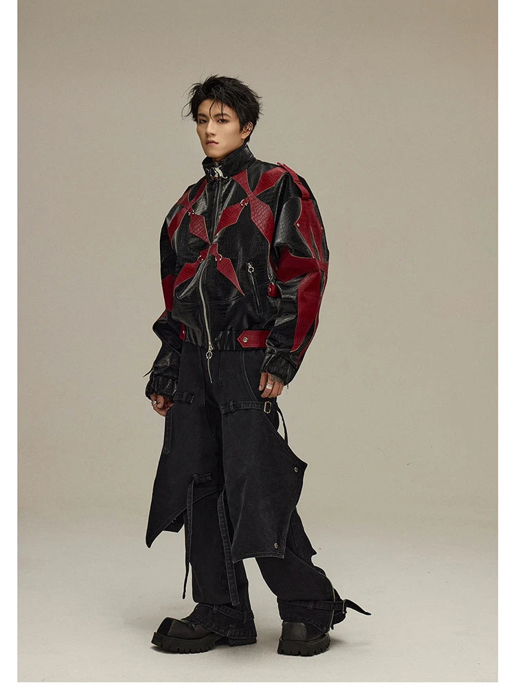 Turn heads like a future rockstar with this Men’s Crocodile Faux Leather Jacket. Made from high-quality faux crocodile leather, this black jacket features bold red cross appliqués and edgy septum-style rivets for a look that’s totally unique. The front zipper closes all the way up to form a cool turtle-neck style, while the ruched trim and sleeves add a punch of punk attitude.