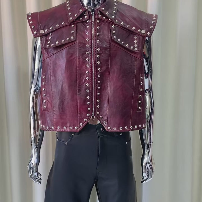 Unleash your inner rockstar with the Men's Faux Leather Rivet Waist Coat, designed to make a bold statement. Crafted from high-quality faux leather in a burgundy red shade, this sleeveless vest features a turn-down collar and rugged metal rivets on the pockets, shoulders, collar, and trim. The zipper closure ensures easy wear, while the polyester lining offers comfort during all-day festival adventures. Perfect for layering over your favourite tees or shirts.
