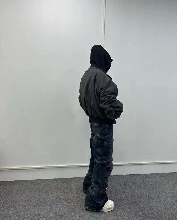 Introducing our Men's Suede Hoodie Bomber Jacket, made with high-quality, vegan-friendly PU faux leather. Available in grey, black, dark grey, and beige, this bomber style jacket features ruched ribbed sleeves and an attached cotton hoodie for added warmth and style. Perfect for layering over any festival outfit, with a front zipper closure and drawstrings for a customized fit. Available in medium and large sizes - be sure to check our measurements carefully!