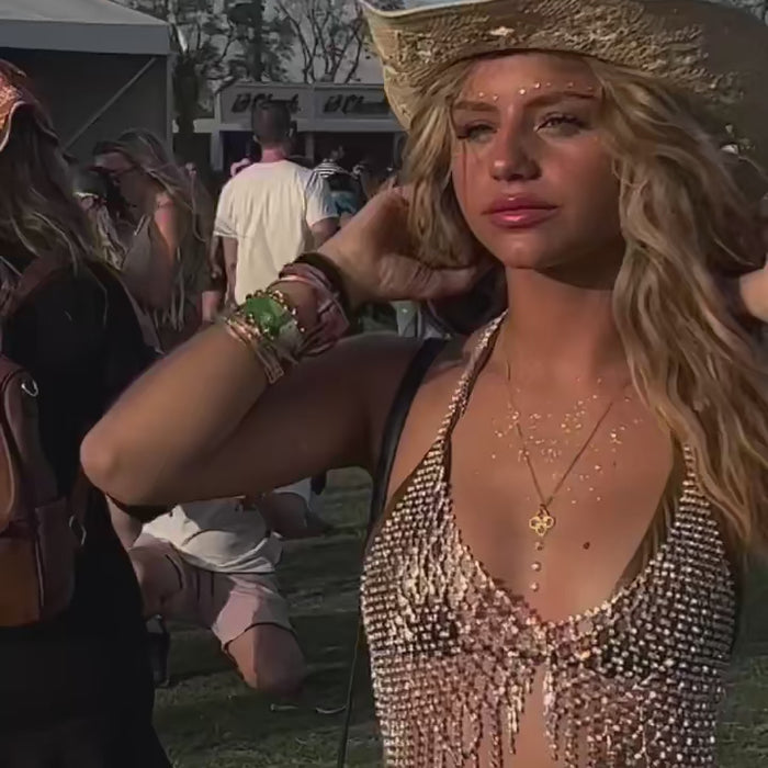 Bling, Bling, Bling! Wir freuen uns, dieses wunderschöne, glitzernde Strass-Top speziell für Festival-Rave-Fans präsentieren zu können. Einfach einpacken und tragen – einfach über den Lieblings-Tanz-BH oder das Bralette ziehen und los geht‘s: Zing, Zing, Zing!