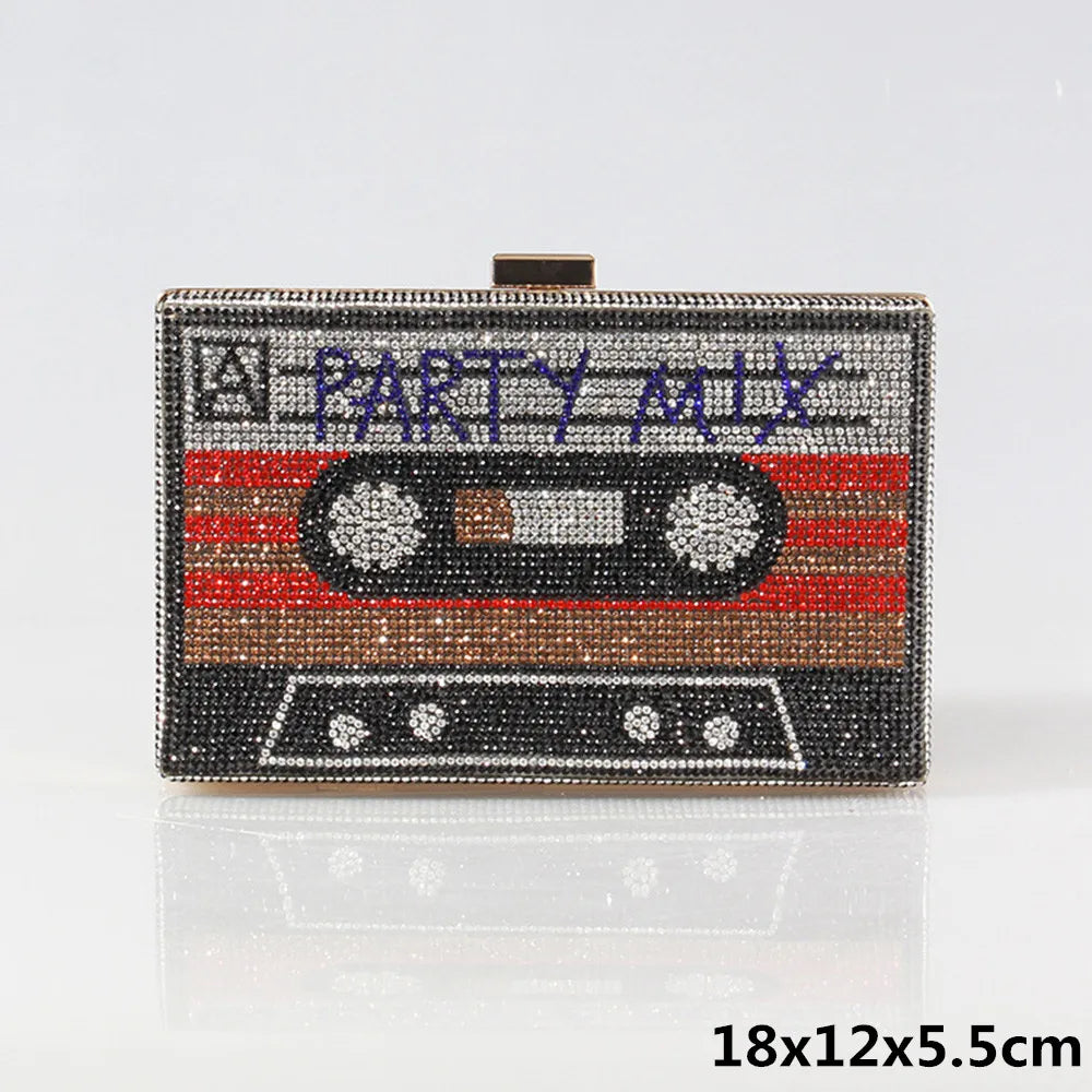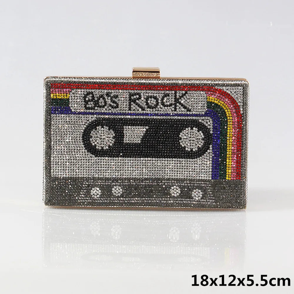 Meet the Rhinestone Cassette Clutch – a shimmering sensation! 🌟 Dazzled with countless rhinestones, this hard-shell beauty boasts a chic gold chain for easy handling and two styles: the rebellious '80s rock or the party-ready mix. 💎