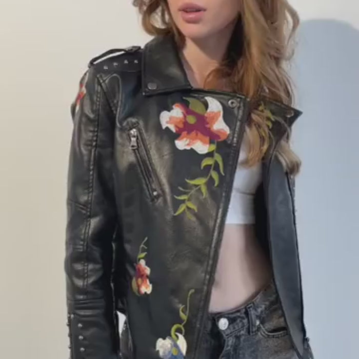 A gorgeous faux leather biker style, waist length jacket with a feminine twist. Ideal for rocking up to the rock band stage in your chunkiest of boots. But, equally as great to wear around town, heading into work or with a plain woollen dress and stylish, long length boots for autumn evening glamour.