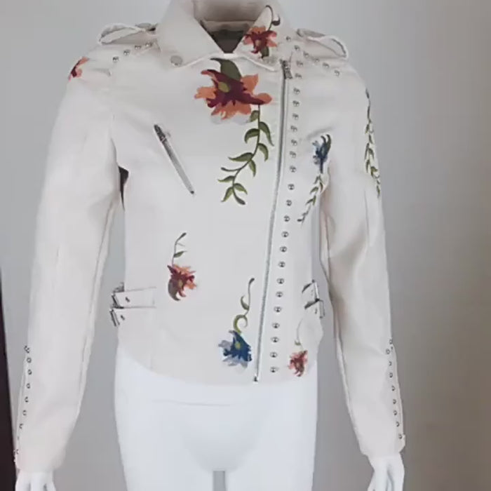 Features: Belt, Rivets, Pockets, Epaulet, Zippers, Turn down collar, Embroidered flowers