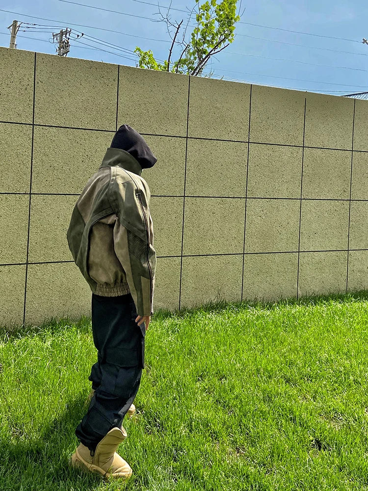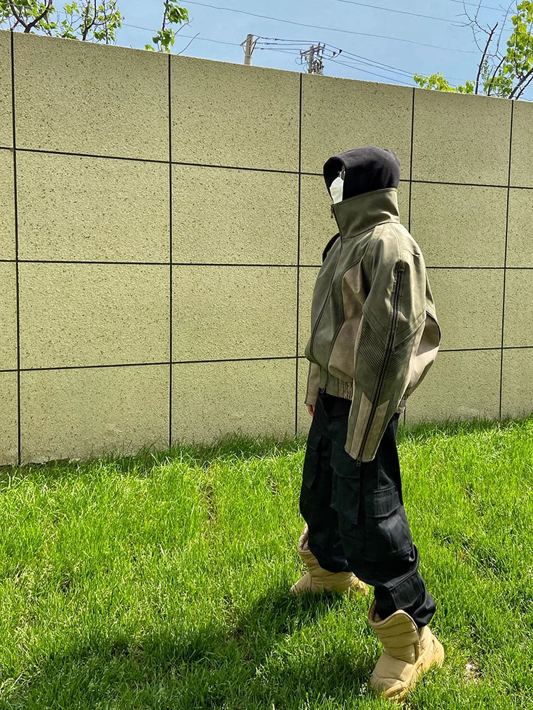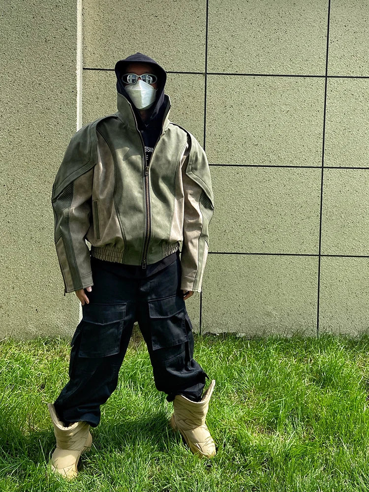 Maximize your style and comfort with our Men's Faux Leather Patchwork Jacket. Made from PU, this jacket is waterproof and perfect for any outdoor festival. Featuring a front zipper closure and front pockets, this jacket has an oversized fit and a unique green and beige patchwork distressed design. With the option to wear it as a zipped up turtleneck or with a turned down collar, you'll be ready for any weather your next festival throws at you!