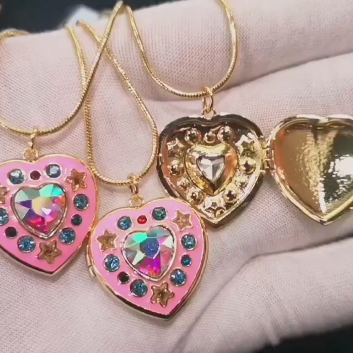 Available in enchanting heart and star shapes, these lockets feature vibrant holographic gems that dance with colour and light. Open the locket to find space for your cherished tiny photos.