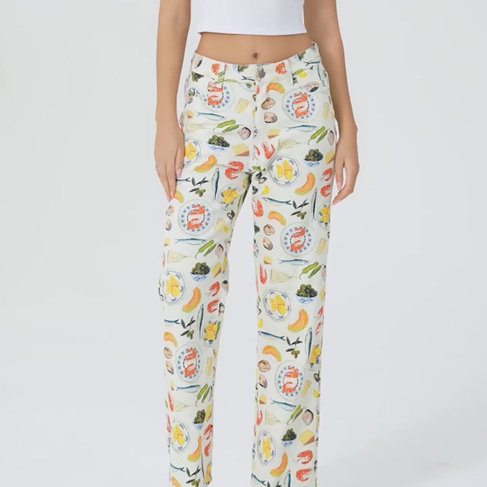 Introducing the ultimate fashion statement for food lovers - our Food Print Straight Leg Trousers! Made from a blend of high-quality cotton and polyester, these trousers feature a variety of unique food prints such as olives, prawns, cheese, and fruits. With a low waist and elastic waistband, they offer a comfortable and flattering fit for all body types. The straight leg cut and ankle-length design give a classic and stylish look, perfect for any food festival.