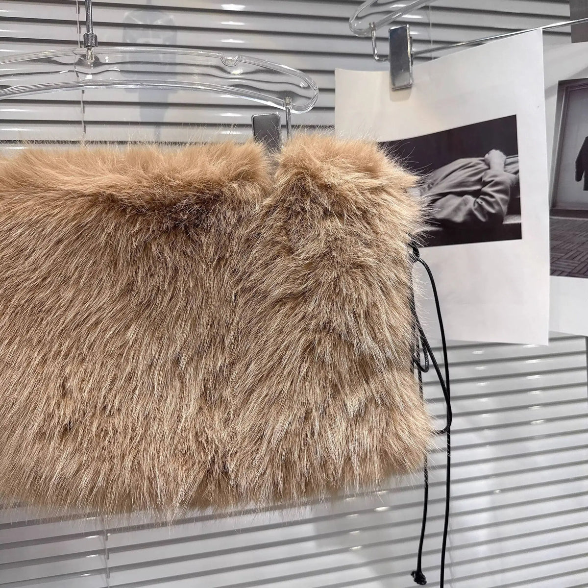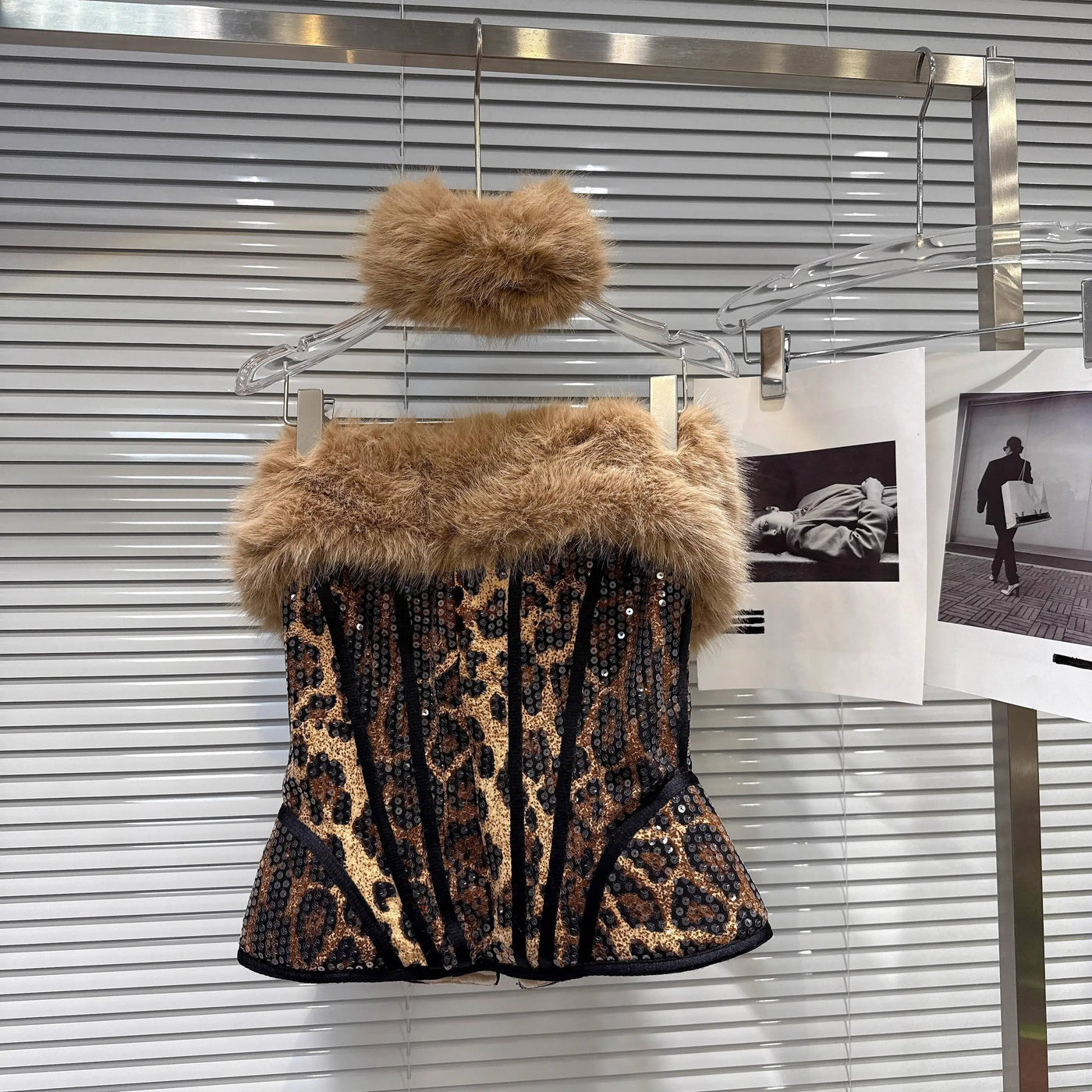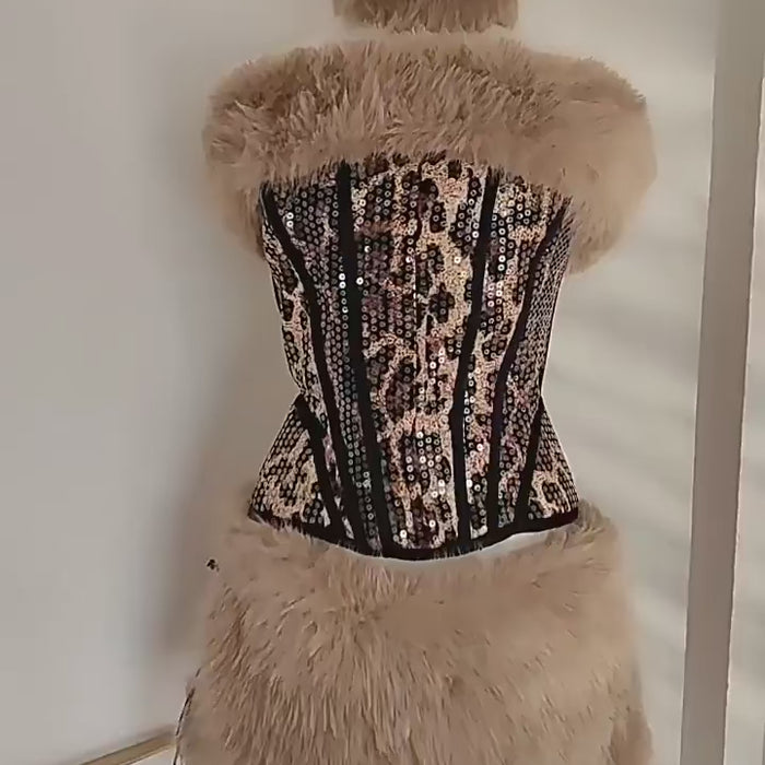 Step into your main character era with this fierce three-piece set straight outta the early 2000s! Featuring a sparkly sequin strapless leopard bandeau top with a light brown faux fur trim, this boned corset-style top hugs you just right with a zip-up back. The matching faux fur mini skirt ties at the side and has a comfy inner lining—perfect for strutting your stuff at your next festival! Top it off with the cosy faux fur collar and you're officially Y2K royalty.