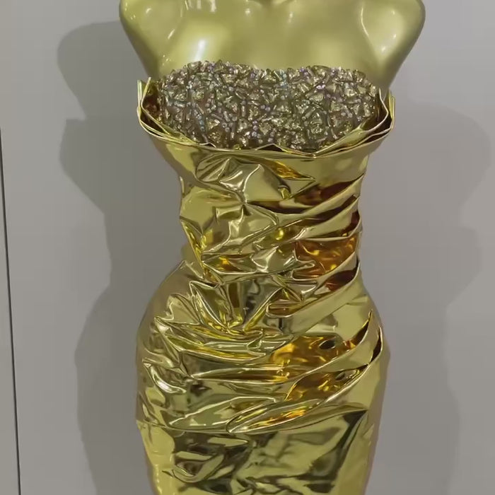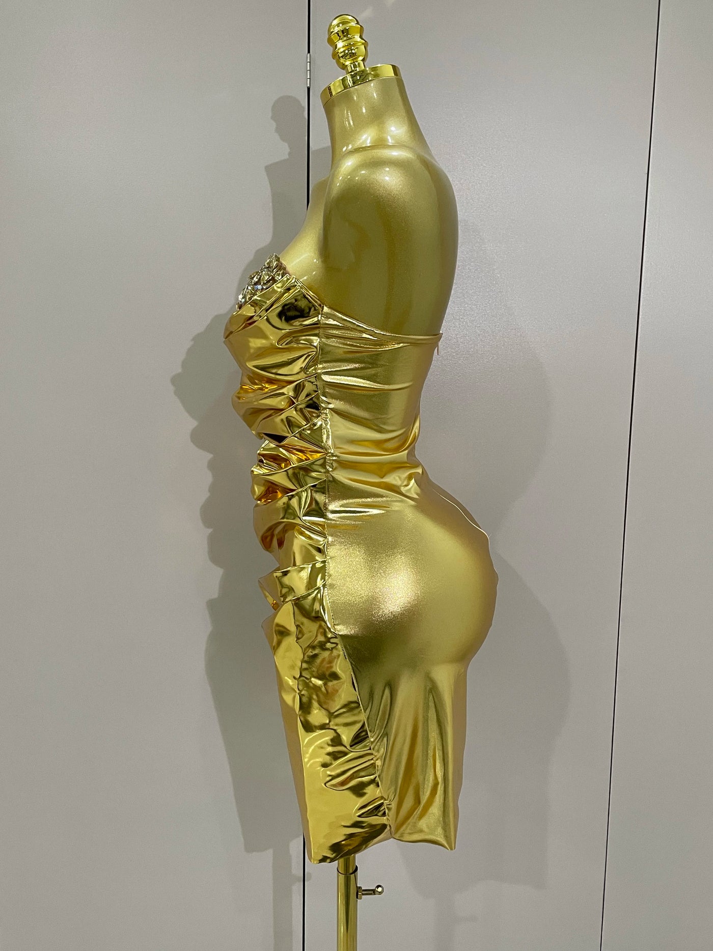 Turn every head at your next festival with this dazzling mini dress made for the spotlight! This unique, luxury dress features a shimmering gold metallic ruched bottom half and a rhinestone-encrusted strapless bust. With a snug, stretchy fit (thanks to polyester + spandex), it’s perfect for festivals, performances, or any night you want to shine. Zipper closure in the back keeps it secure. Please check measurements carefully.