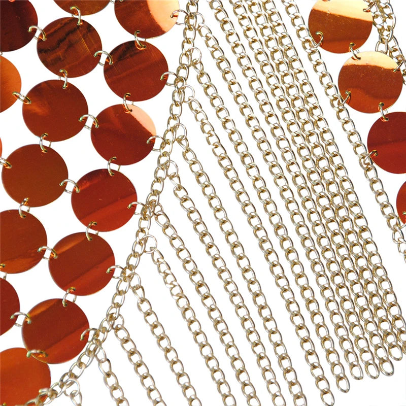 Upgrade your festival style with our Circle Sequin Tassel Two Piece Set. Made from lightweight polyester and alloy, the crop top and mini skirt feature an eye-catching holographic gold sequin design. But the real showstopper? The gold tassels that dangle from the set, adding a playful touch to your Burning Man look. Fastened with chain links and a lobster clasp, this set is perfect for dancing the night away.