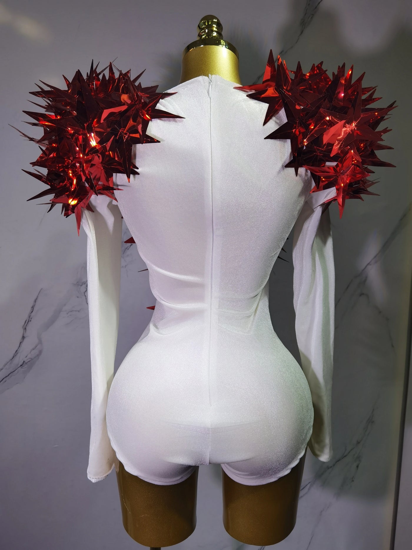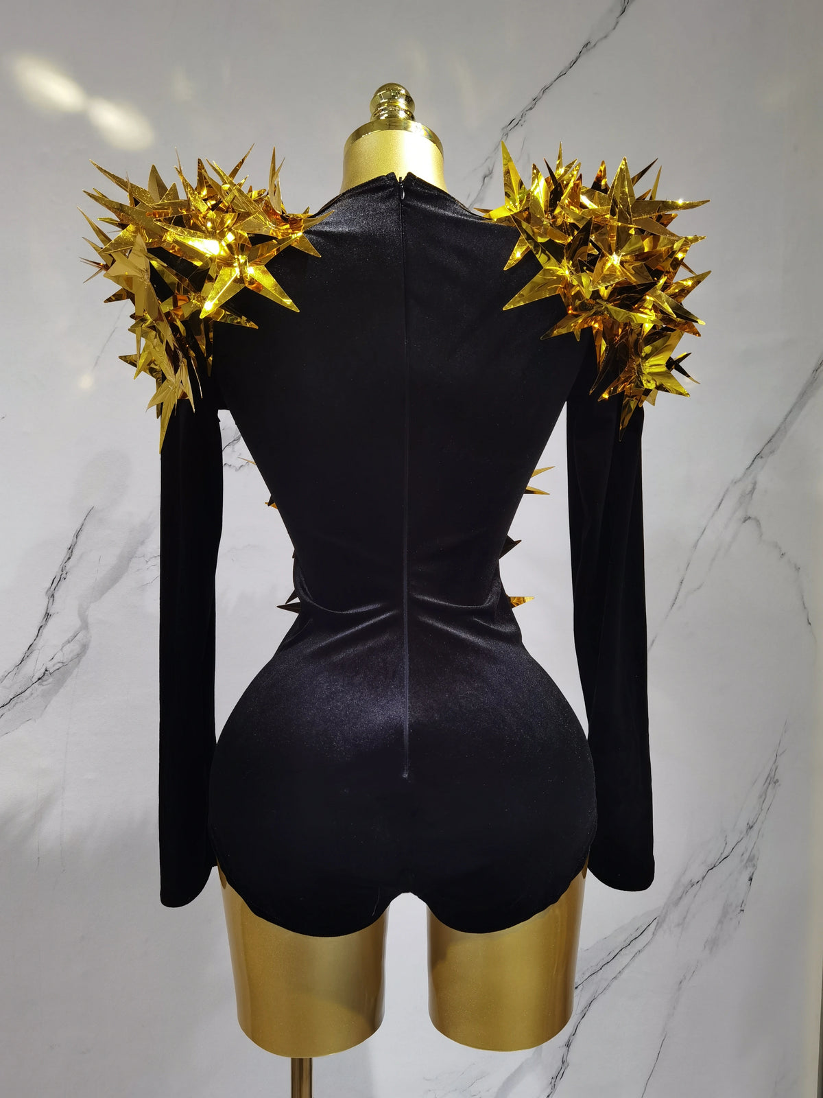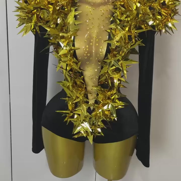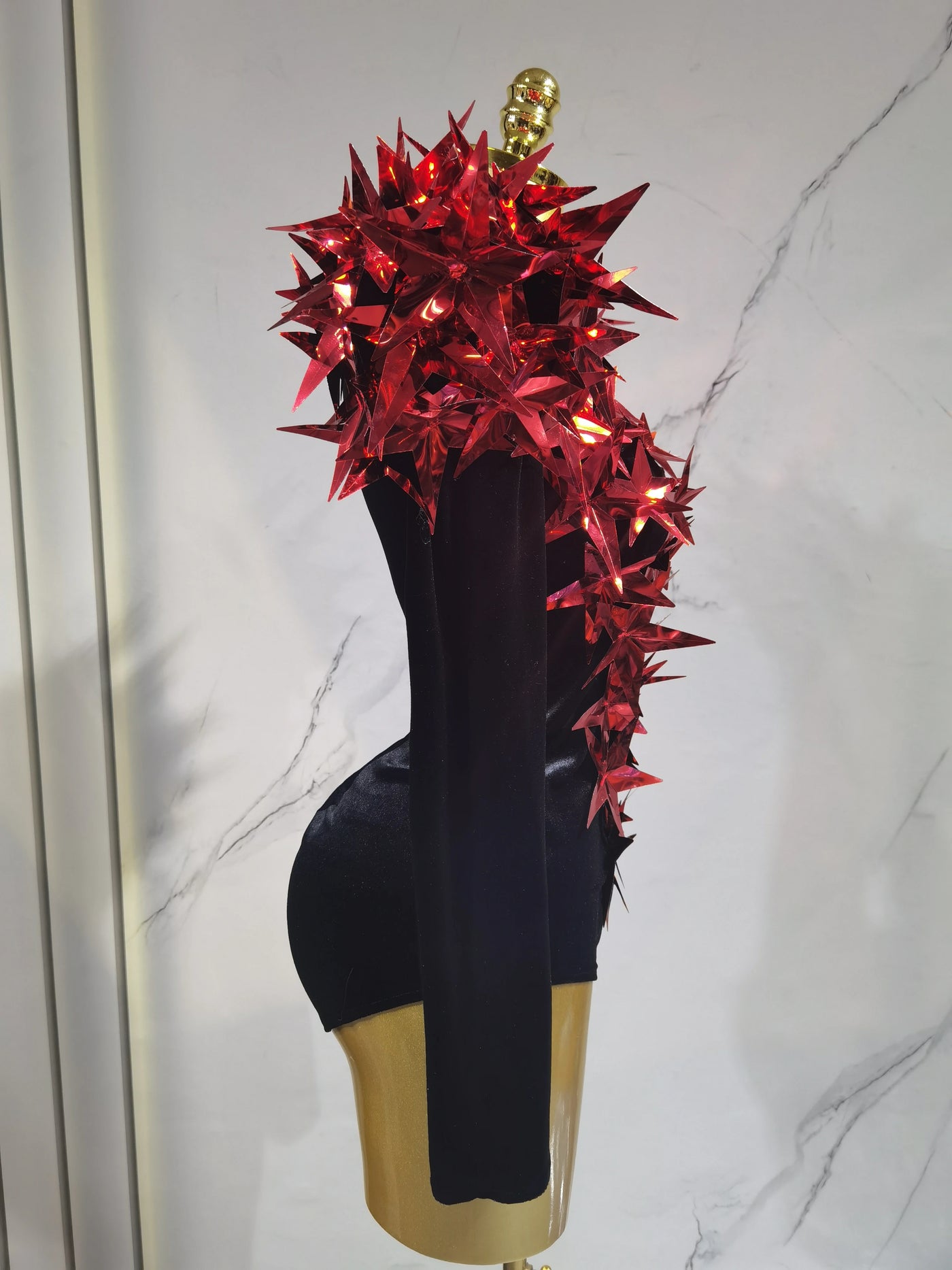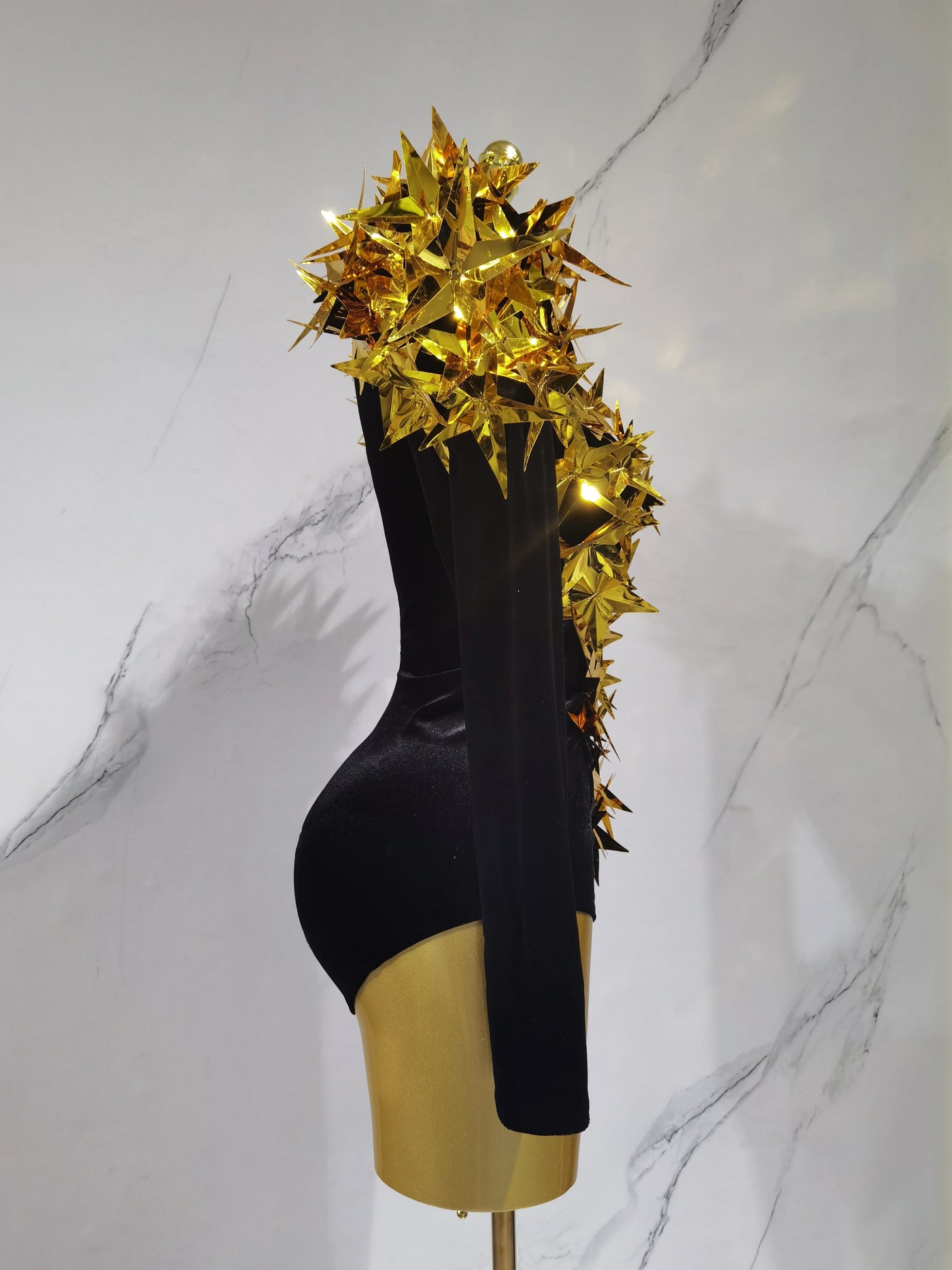 Unlock your inner star power with the Heavily Embellished Star Bodysuit! This dazzling bodysuit, available in a variety of colours, is the perfect addition to any performer's wardrobe. Its long sleeves, deep V neck, and mesh panelling with rhinestones on the chest make for a stunning and comfortable fit. You'll feel like a true star with the large 3D statement stars made from acetate that form around the shoulders and down the front. Made from velvet and stretchy material, this bodysuit hugs your figure in all the right places, ensuring both style and comfort. Whether you're hitting the stage, a rave, or a festival, this bodysuit is sure to make you stand out and shine.
