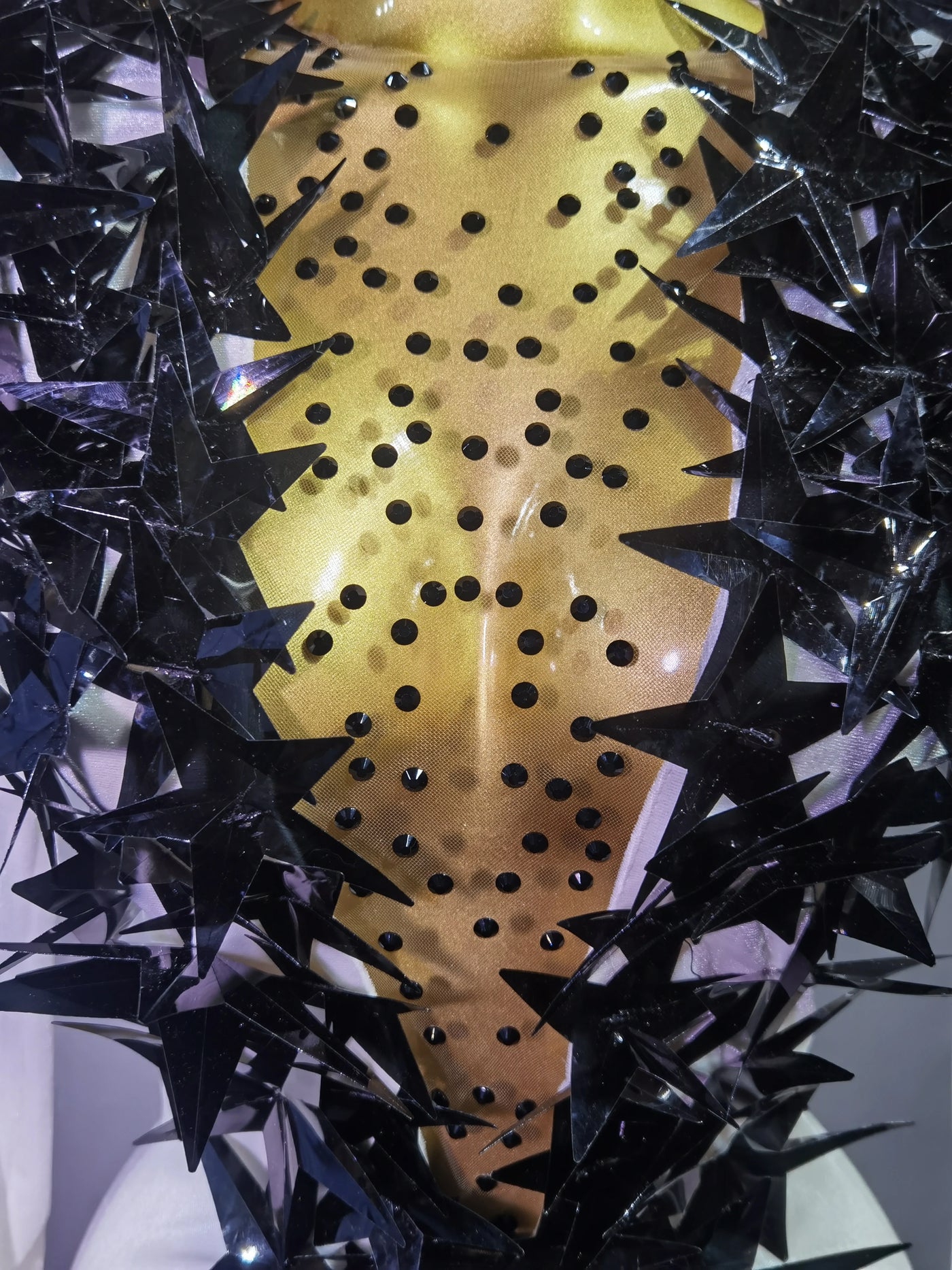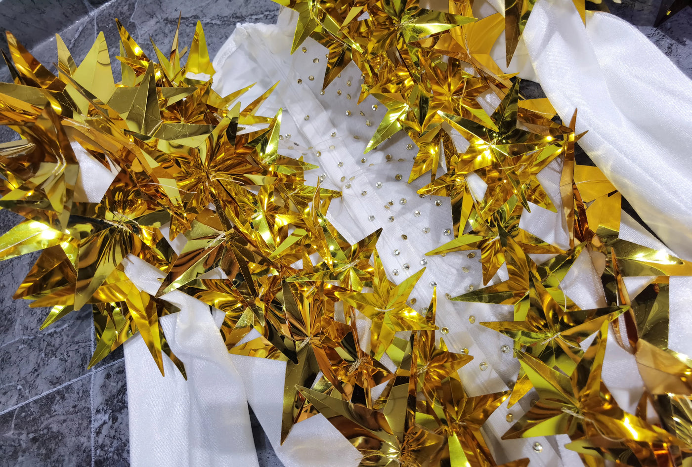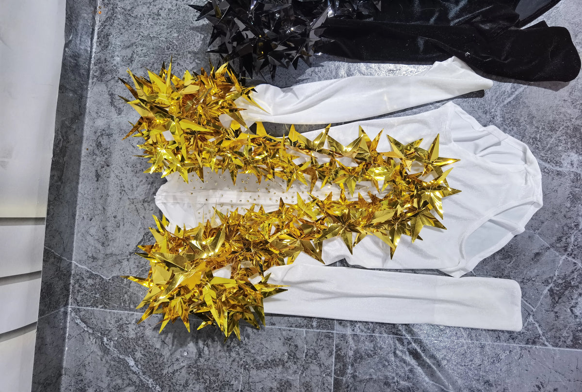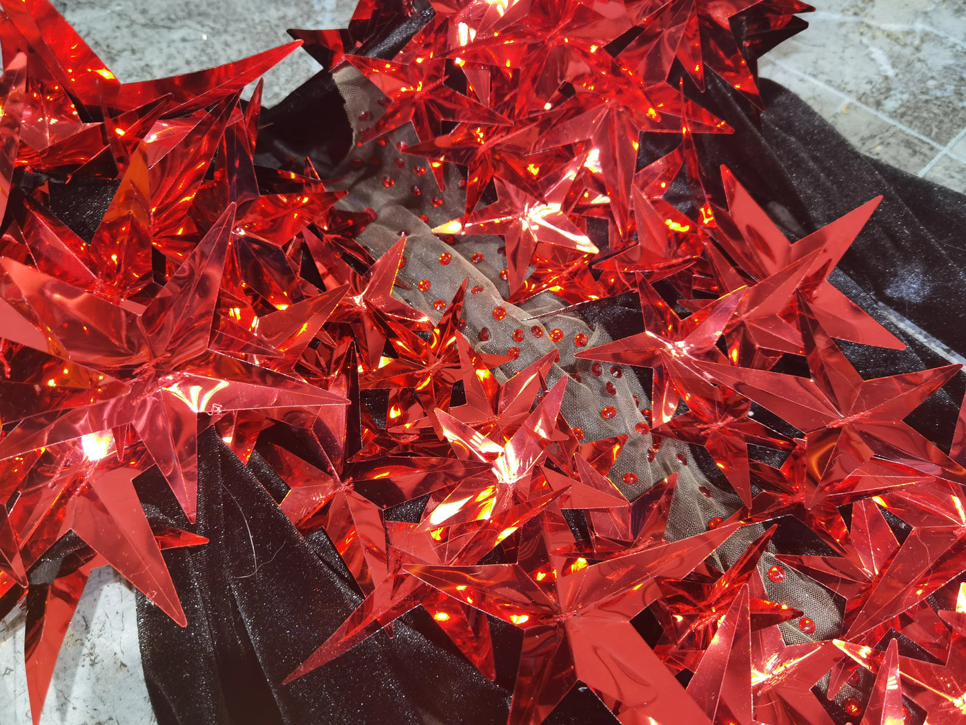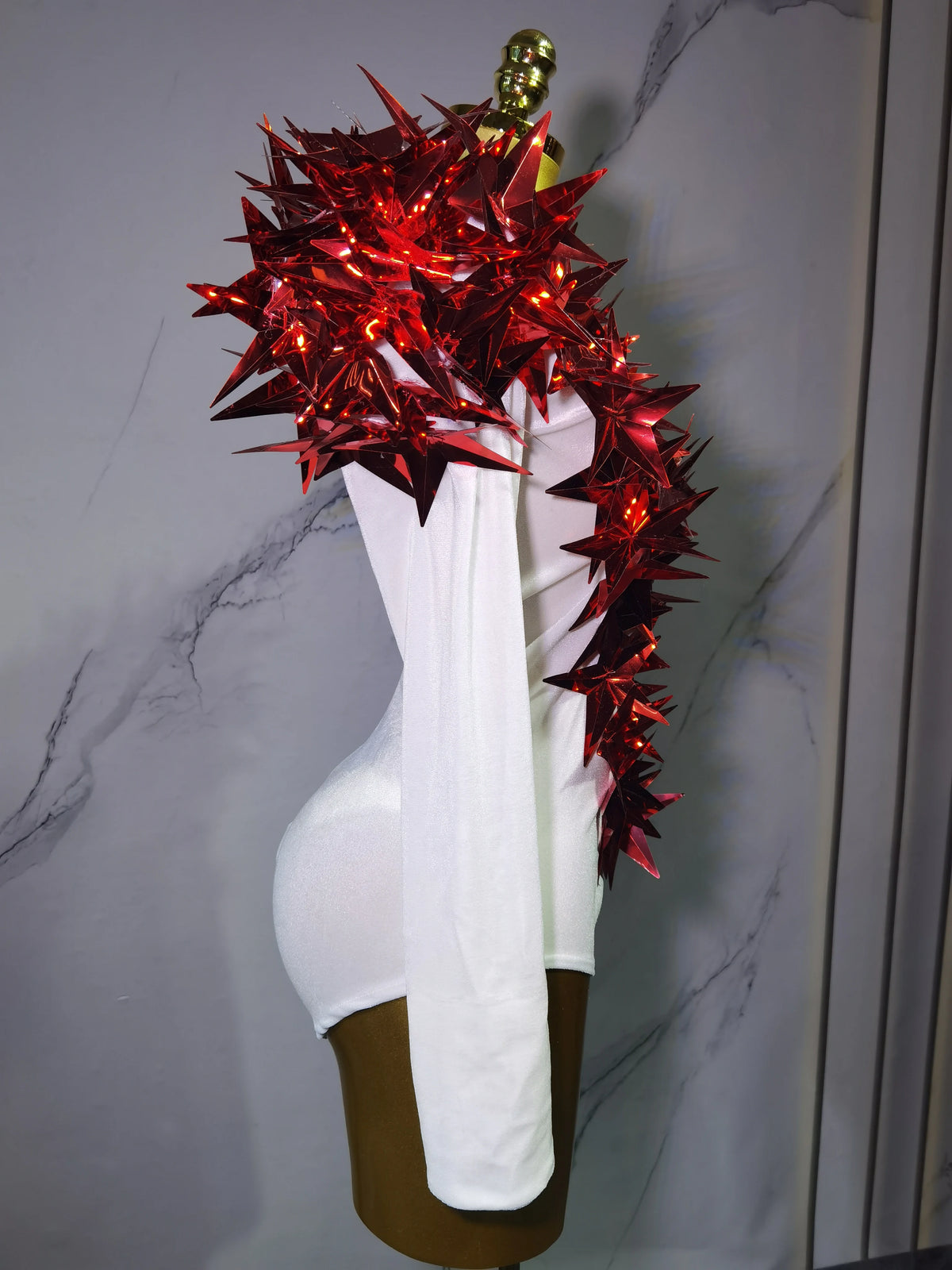 Unlock your inner star power with the Heavily Embellished Star Bodysuit! This dazzling bodysuit, available in a variety of colours, is the perfect addition to any performer's wardrobe. Its long sleeves, deep V neck, and mesh panelling with rhinestones on the chest make for a stunning and comfortable fit. You'll feel like a true star with the large 3D statement stars made from acetate that form around the shoulders and down the front. Made from velvet and stretchy material, this bodysuit hugs your figure in all the right places, ensuring both style and comfort. Whether you're hitting the stage, a rave, or a festival, this bodysuit is sure to make you stand out and shine.