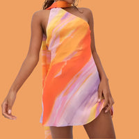 Designed for the ultimate summer festival look, this One Shoulder Orange Gradient Dress offers a striking combination of vibrant orange, purple, and yellow hues. The A-line silhouette and backless design create a trendy and flattering fit, while the long neck scarf adds an extra touch of elegance. Made from high-quality polyester, this mini dress is a must-have for any fashion-forward individual. Available in sizes small, medium, and large, it's the perfect addition to your summer wardrobe. Please check measurements carefully.