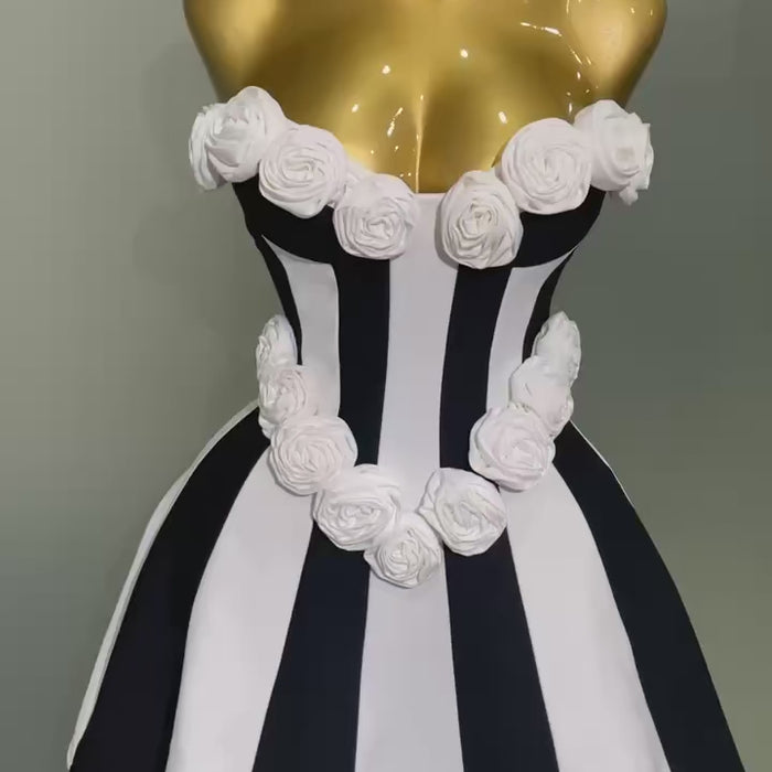 Bold, fun, and full of personality—this dress is a showstopper! With a classic A-line shape that hits above the knee, it hugs your figure just right thanks to the comfy stretch of polyester and spandex. Featuring striking black and white vertical stripes, it’s topped off with eye-catching 3D rose flowers at the bust and waist. The strapless, sweetheart shaped top and lace-up back adds a flirty touch.