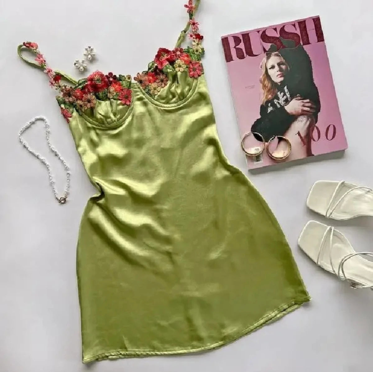 La robe florale brodée en satin vert est une superbe robe parfaite pour toute journée d'été ou festival.