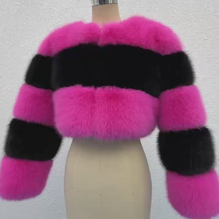 Add a burst of colour and fun to your wardrobe with our Cropped Striped Faux Fur Coat. Designed with a trendy cropped length and a zipper closure, this coat is perfect for those who love to stand out. Choose your vibe with vibrant hot pink, lilac, or purple shades, each effortlessly contrasted by bold black stripes. The soft, vegan-friendly faux fur feels luxurious while keeping your look kind to animals. Featuring long sleeves and a cosy O-neck, this playful jacket is ideal for festivals, chilly nights, or anytime you want to brighten up your day with eye-catching style.