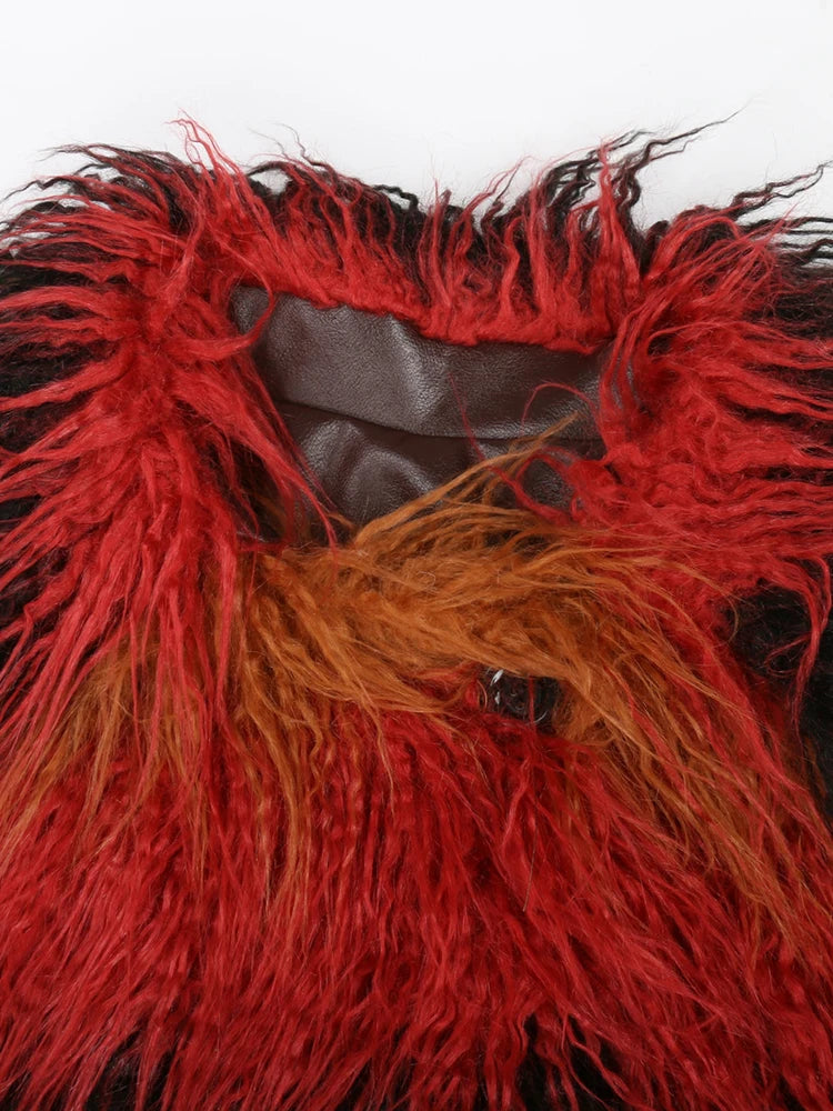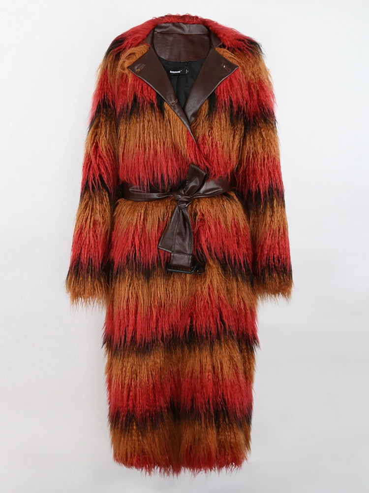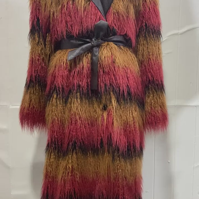 Stay warm this season in our Shaggy Oversized Faux Fur Trench Coat, the ultimate statement piece for cooler festival nights! This eye-catching coat features a bold autumnal colour scheme with black, yellow, orange, and red horizontal stripes. The shaggy, yeti-like faux fur is luxuriously thick, providing plenty of warmth, while the PU brown leather collar and matching waist belt add to the autumnal aesthetic. Designed for comfort, the floor-length coat has a wide waist, front pockets to keep your hands toasty, and a button closure. One size fits most.