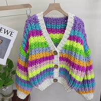 Get cosy and colourful with our Rainbow Chunky Knit Sweater! This festival-ready piece features bold rainbow stripes that bring a splash of colour to chilly festival days. The sweater is designed for warmth and style, with a thick, bohemian knit. It buttons up the front with three large brown buttons and is trimmed in white along the opening, adding a touch of contrast to the playful colours.
