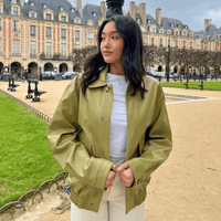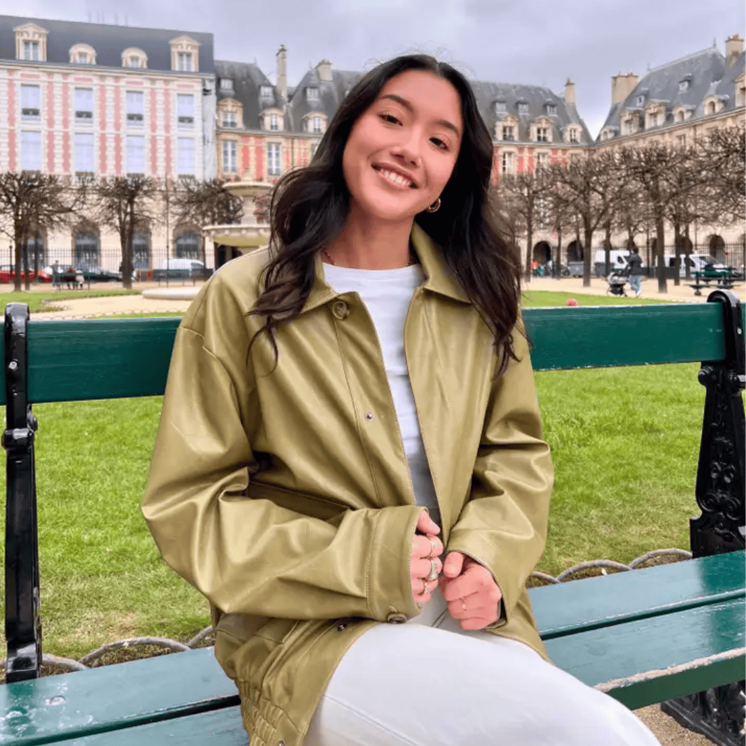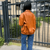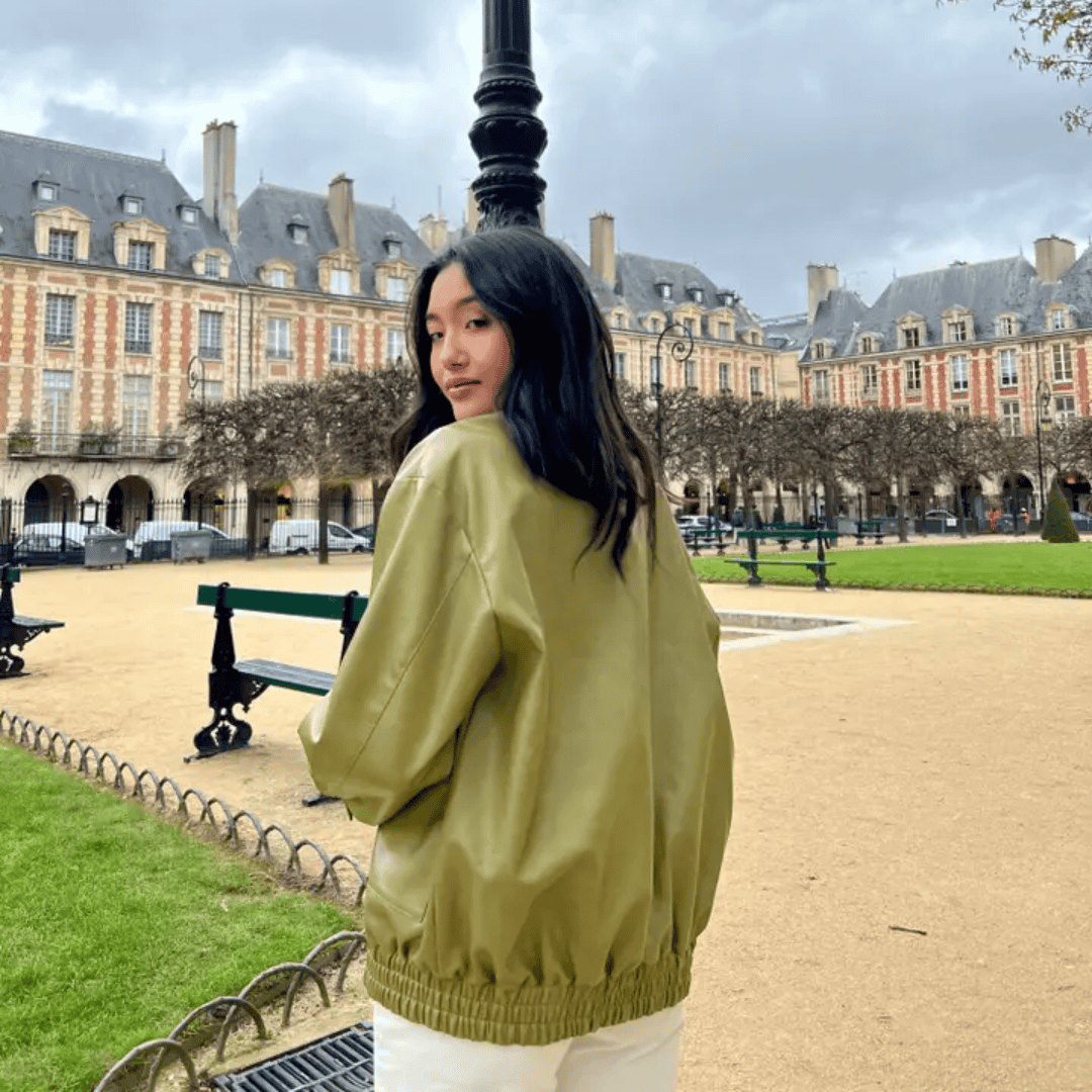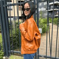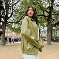 Step up your street style game with our Vinyl Bomber Jacket, imported straight from the fashion streets of Paris! Choose between the soothing sage or the warm cognac shade. This structured bomber jacket is ideal for layering over your festival looks when the temperature drops. Featuring a covered zipper, turn down collar, elasticated waist and handy pockets, it’s crafted from 100% vegan-friendly polyurethane faux leather. Available in small, medium and large.