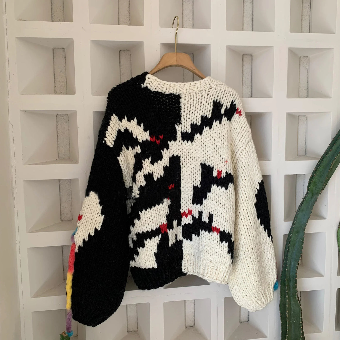Experience ultimate style and comfort with our one-of-a-kind Monochrome Chunky Knit Cardigan. Made from high-quality acrylic material, this cardigan features a V-neck and button closure, showcasing an abstract monochrome print with vibrant multicoloured rainbow knotted tassels. Easy to maintain with dry cleaning or gentle hand washing, this cardigan boasts unique design elements such as balloon sleeves and a bohemian, hippy aesthetic. Perfect for festivals or adding a touch of boho chic to your wardrobe, this hand-knitted cardigan is a must-have.