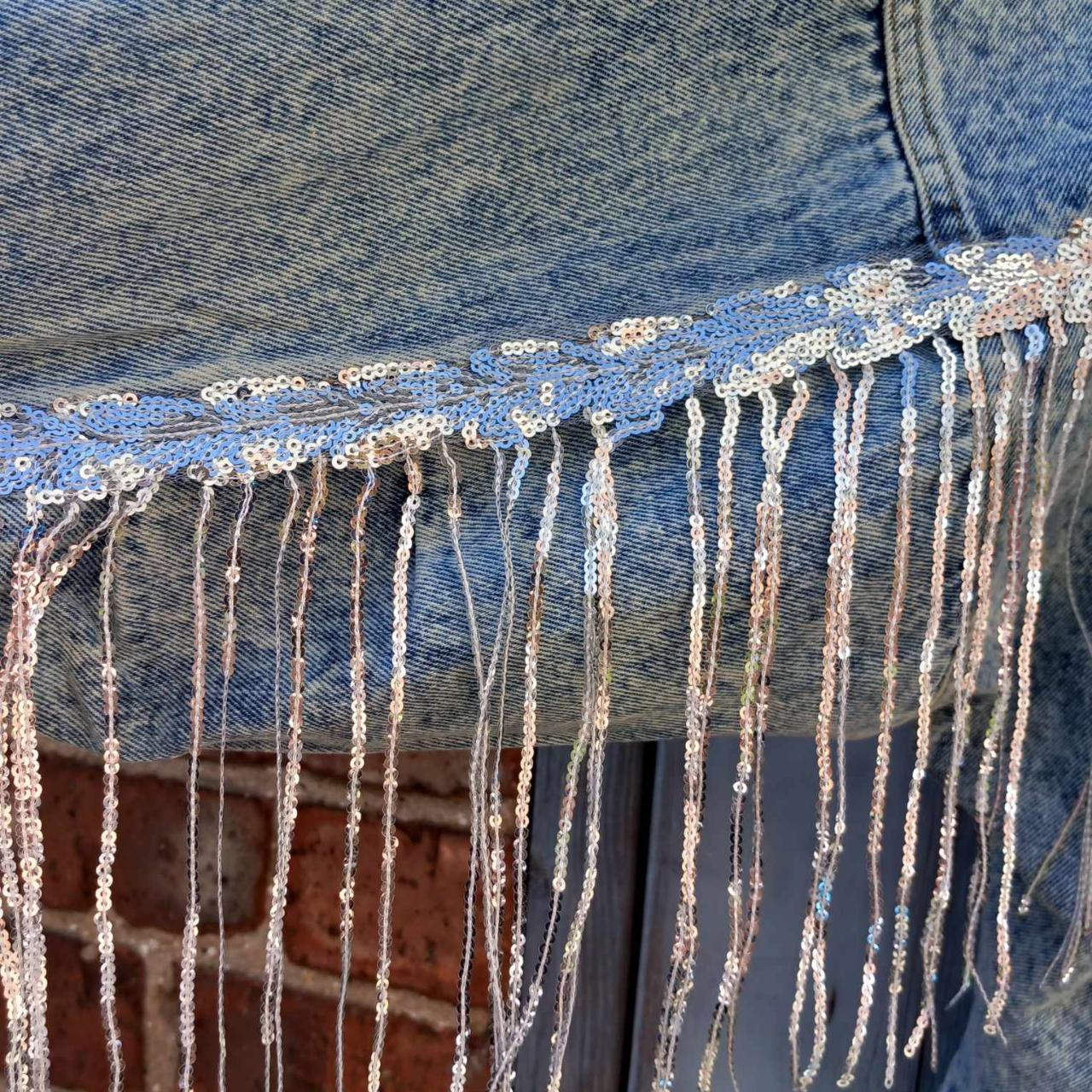 How do you make a denim jacket into a Festival Style Denim Jacket? Easy - just add lovely, sparkling, long length tassels. We have found the perfect example and we are very excited to share this with you. Flatteringly roomy and fashionably short-waisted. Add bling to your outfit with Festigal flare!