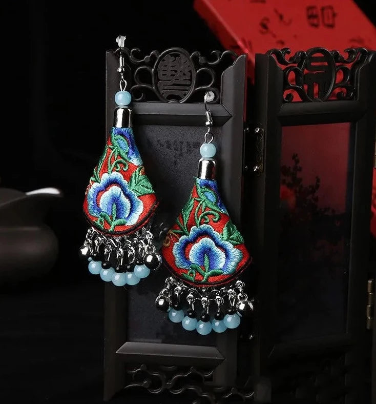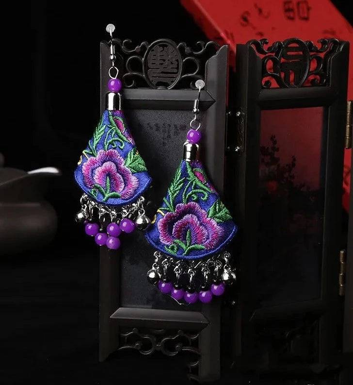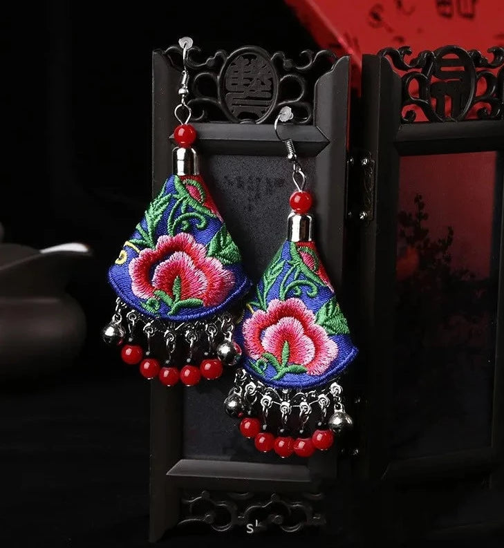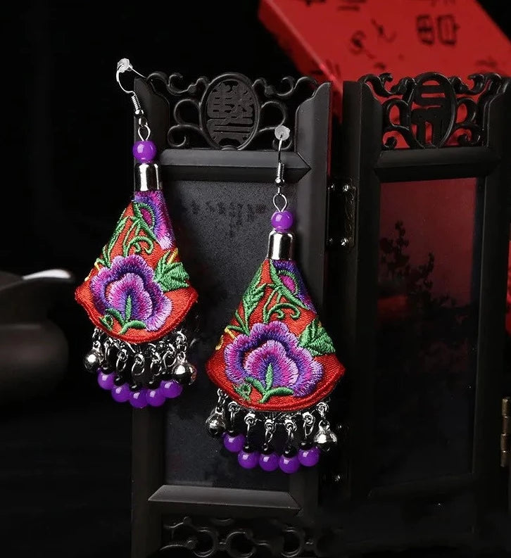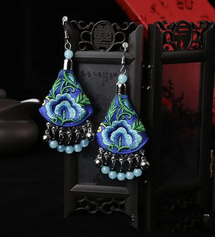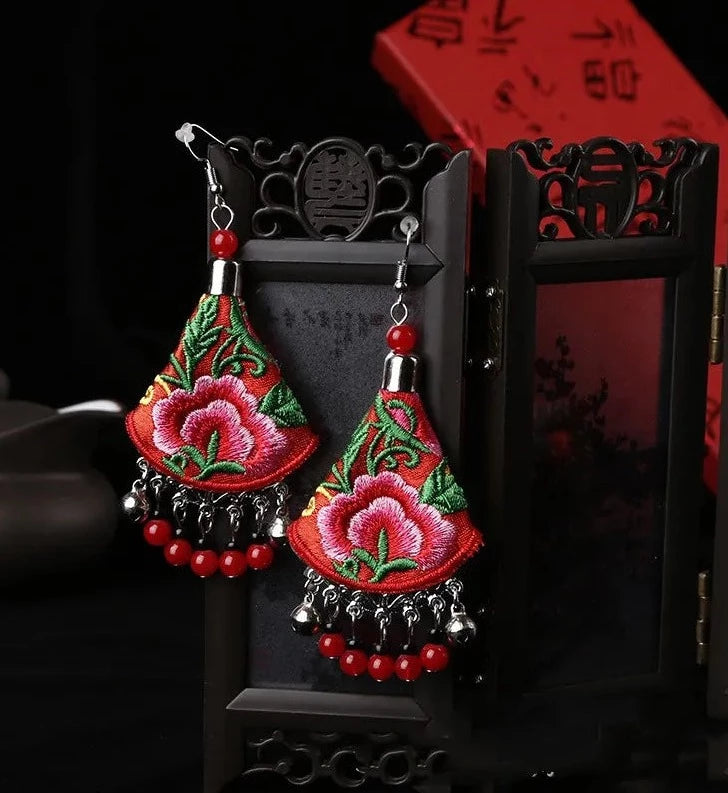 Crafted with care, each earring boasts a whimsical fan shaped embroidered Peony design that adds a touch of floral flair. The suspended bead tassels create a lively and ethnic vibe, perfect for unleashing your free-spirited energy at festivals. Made from durable iron alloy, these earrings dangle and drop with every step, making a bold statement that complements any outfit.