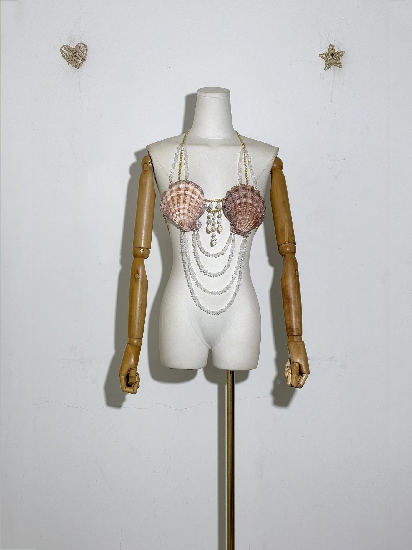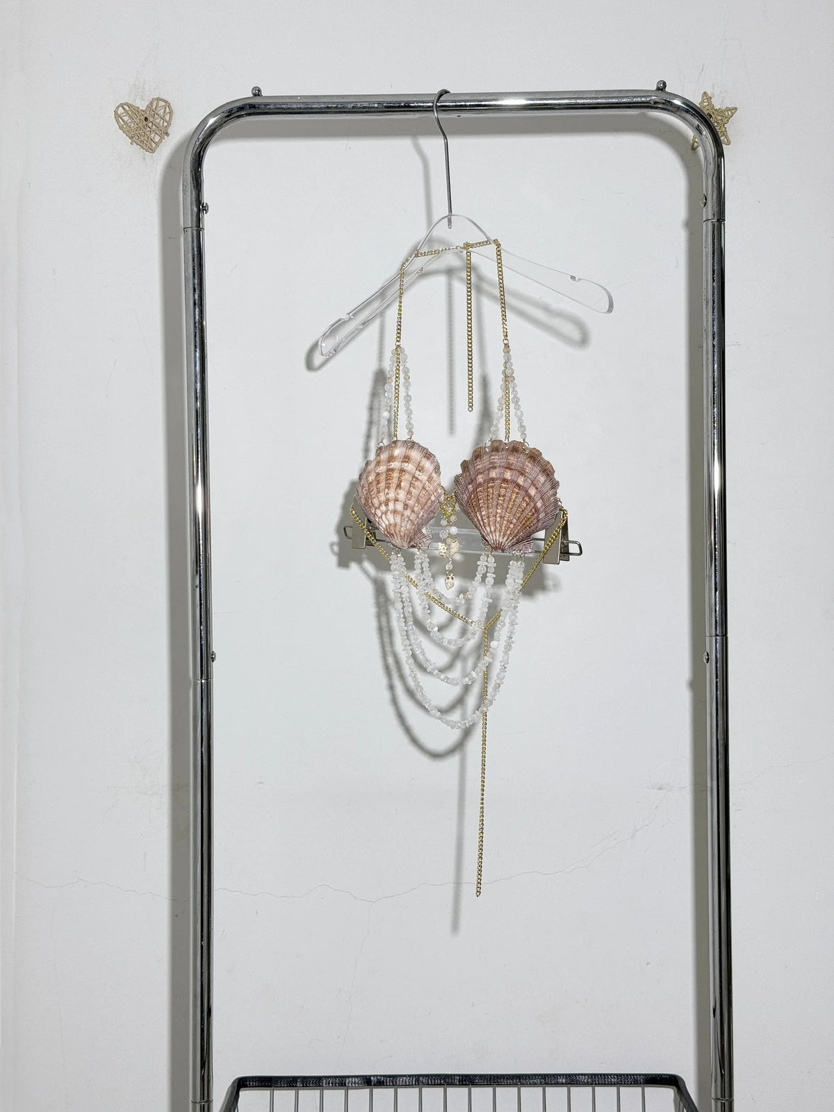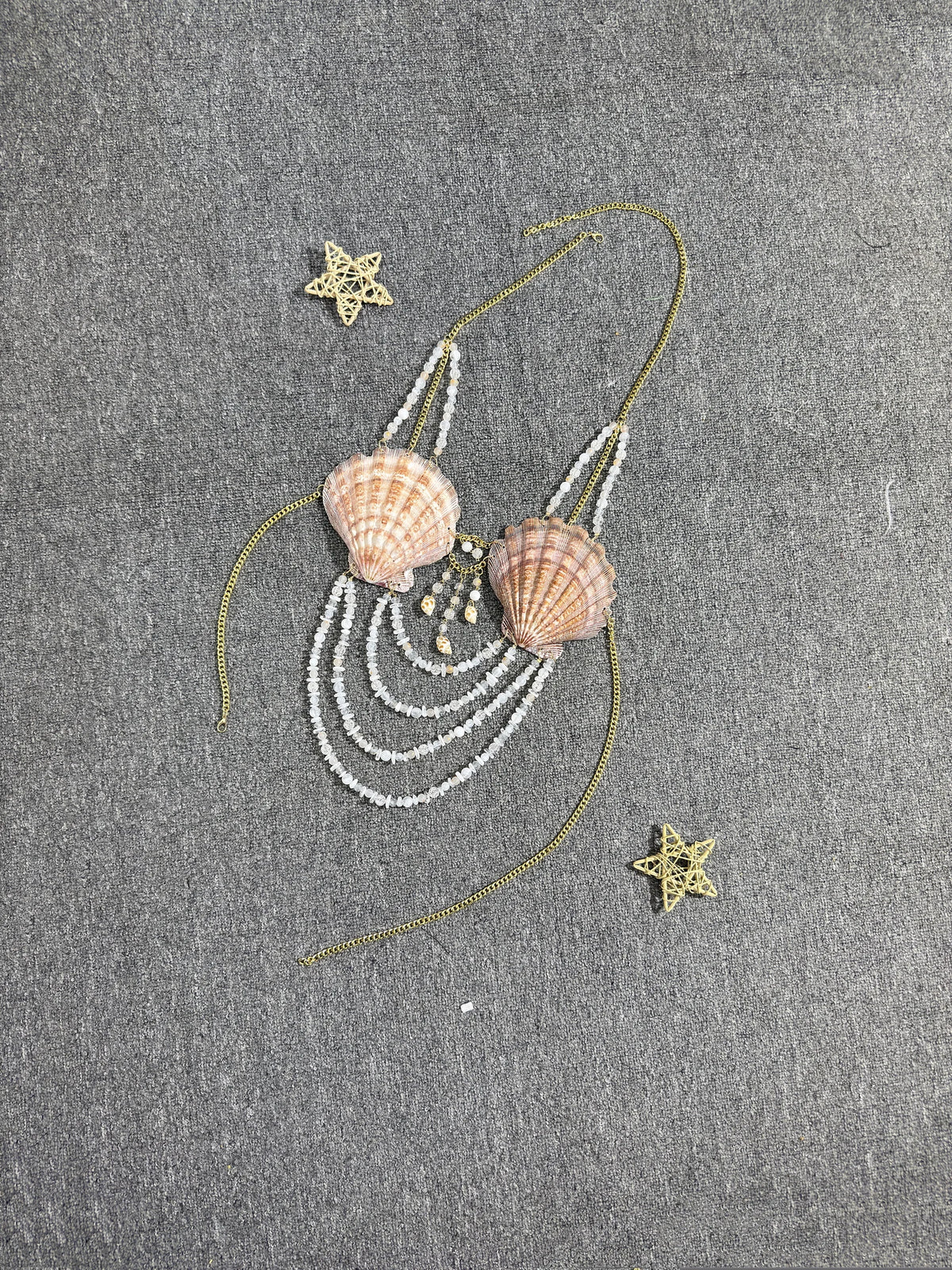 Fastened securely around the neck and back with a lobster clasp, this dreamy crop top features glimmering chains, magical shells, sparkling beads, and ocean-kissed stones that cascade like treasures below the bust. The shoulder straps? Yep—decorated with dainty bead accents for that extra shimmer.