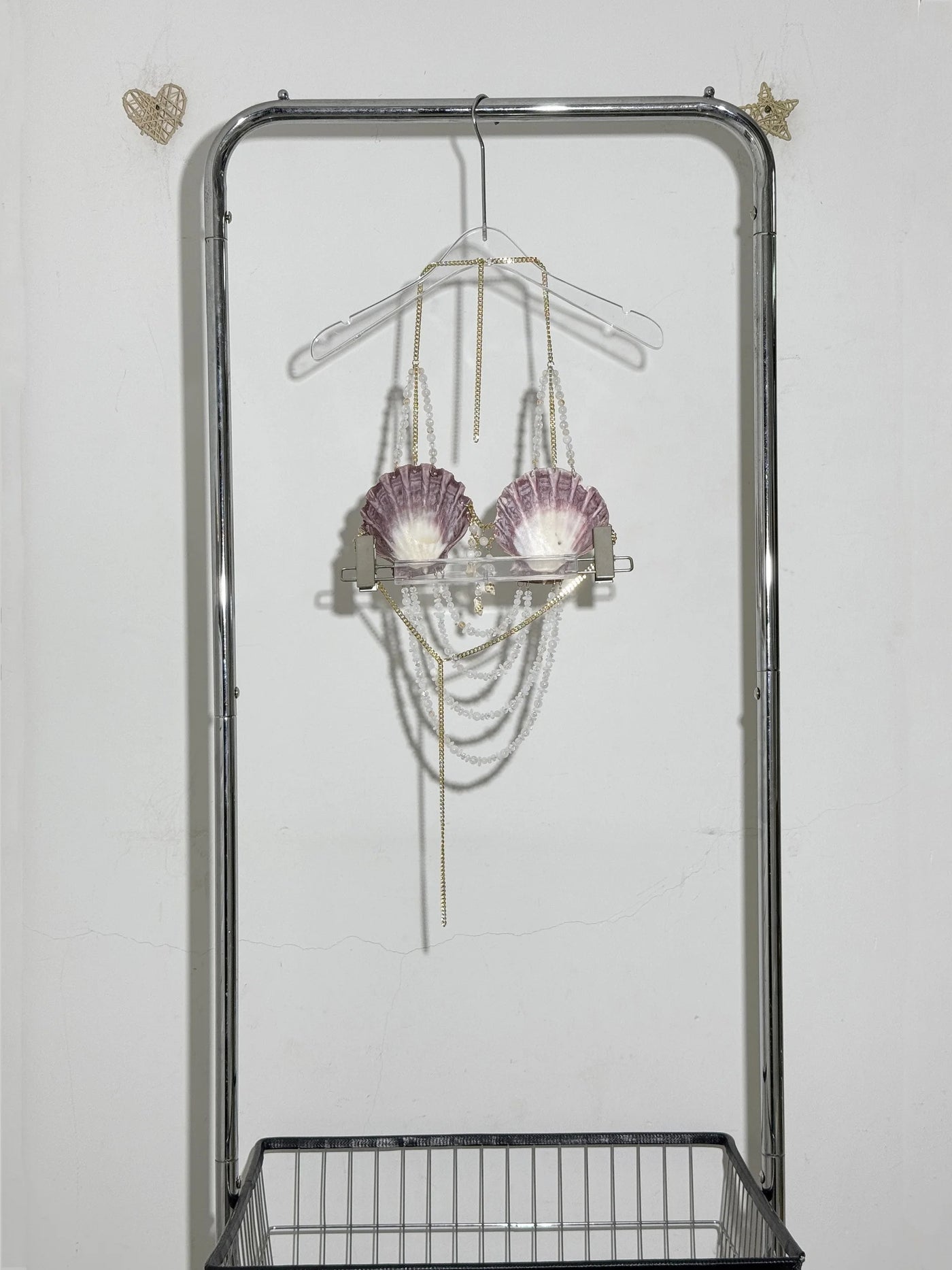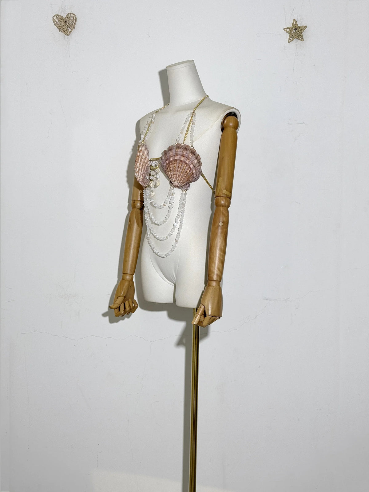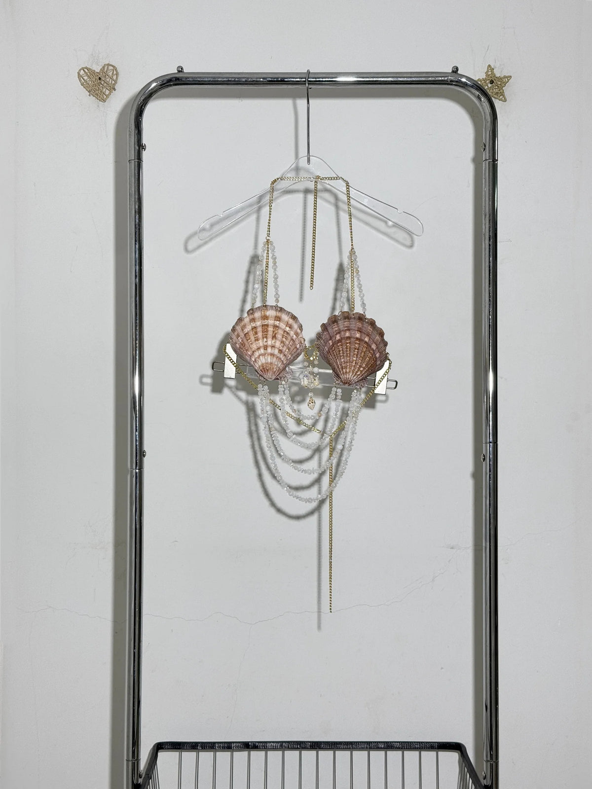 Fastened securely around the neck and back with a lobster clasp, this dreamy crop top features glimmering chains, magical shells, sparkling beads, and ocean-kissed stones that cascade like treasures below the bust. The shoulder straps? Yep—decorated with dainty bead accents for that extra shimmer.