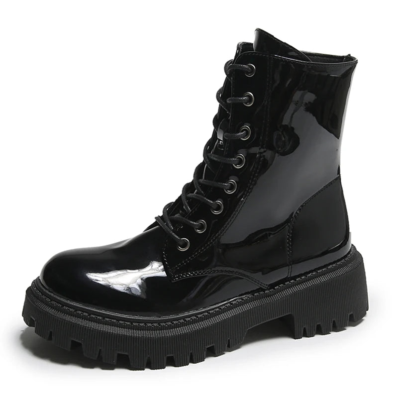 Complete your edgy style with our Lace Up Faux Leather Ankle Boots. Crafted from patent PU leather, these boots are a perfect fusion of gothic and punk aesthetics.