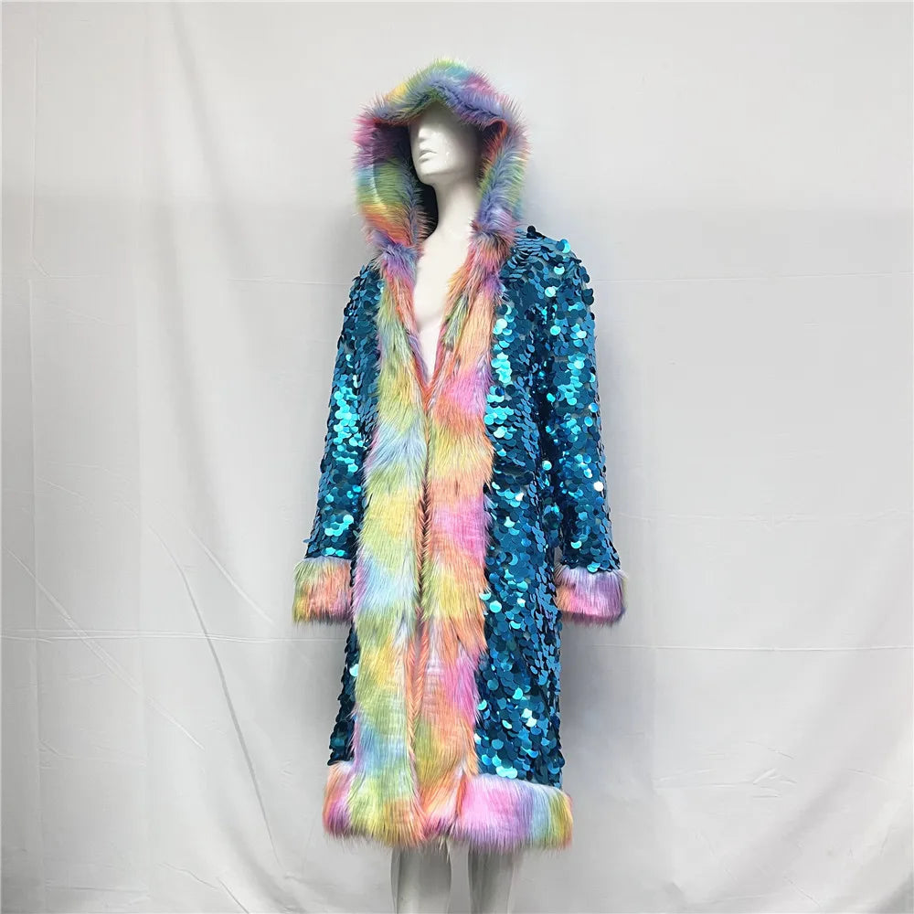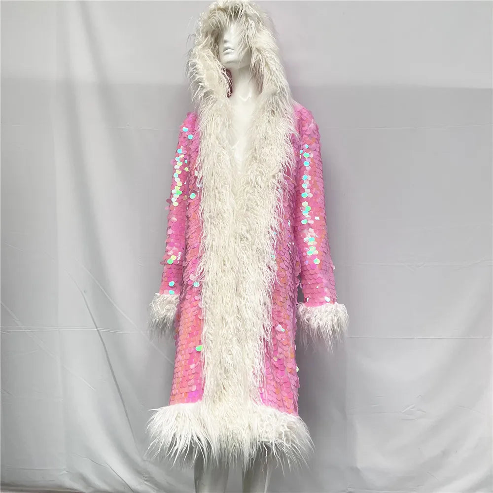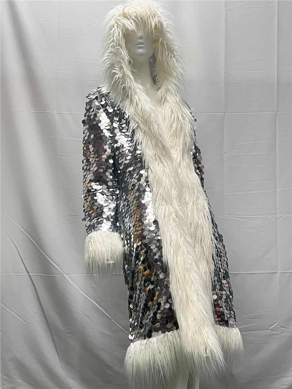 This knee-length stunner isn't just about looks; it’s about warmth and comfort too. The coat features all-over sequins, including on the hood, with a luxurious faux fur trim that lines both the hood and the coat. The wide-waisted design and button closure ensure a flattering fit, making you feel as fabulous as you look.