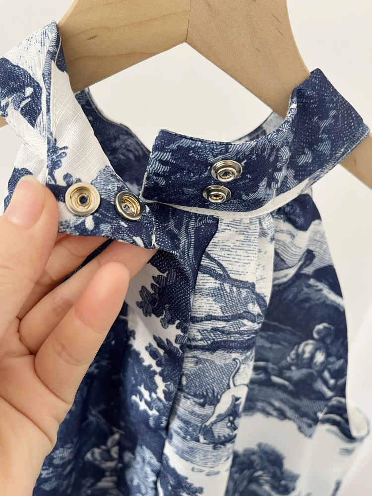Achieve a unique and bohemian look with our Halter-neck Landscape Midi Dress. Made from high-quality polyester, this sleeveless dress features an O-neck halter neck top with popper closure, an ankle-length A-line silhouette, and a stunning print featuring a beautiful blue and white oil painting landscape with people, trees, and buildings. Perfect for you next festival, simply dry clean or hand wash with a gentle touch to maintain its quality.