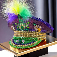 Emerging from the streets of New Orleans, our Mardi Gras Feather Military Hat is a bold fusion of military-inspired style and festive fun. Bursting with vibrant green, yellow, and purple feathers, this hat is a true standout piece for any festival or celebration. Adding a touch of glamour, the hat is encrusted in shimmering gold, purple, and green sequins, while spikey stud detailing adds an edgy touch. Large rhinestones decorate the front, catching the light and drawing attention to your attire. Made from high-quality polyester, this hat will hold its shape and vibrant colours for countless celebrations to come.