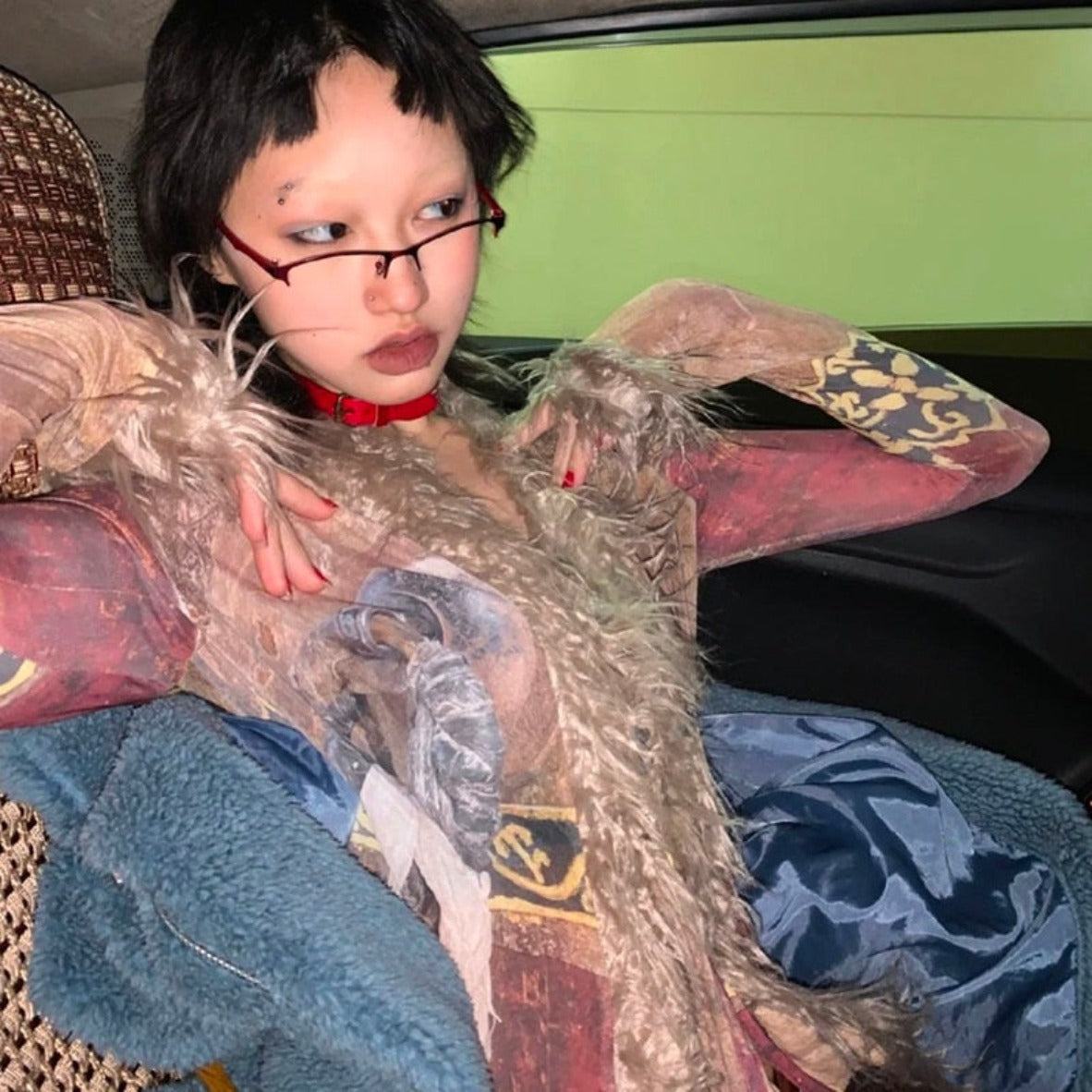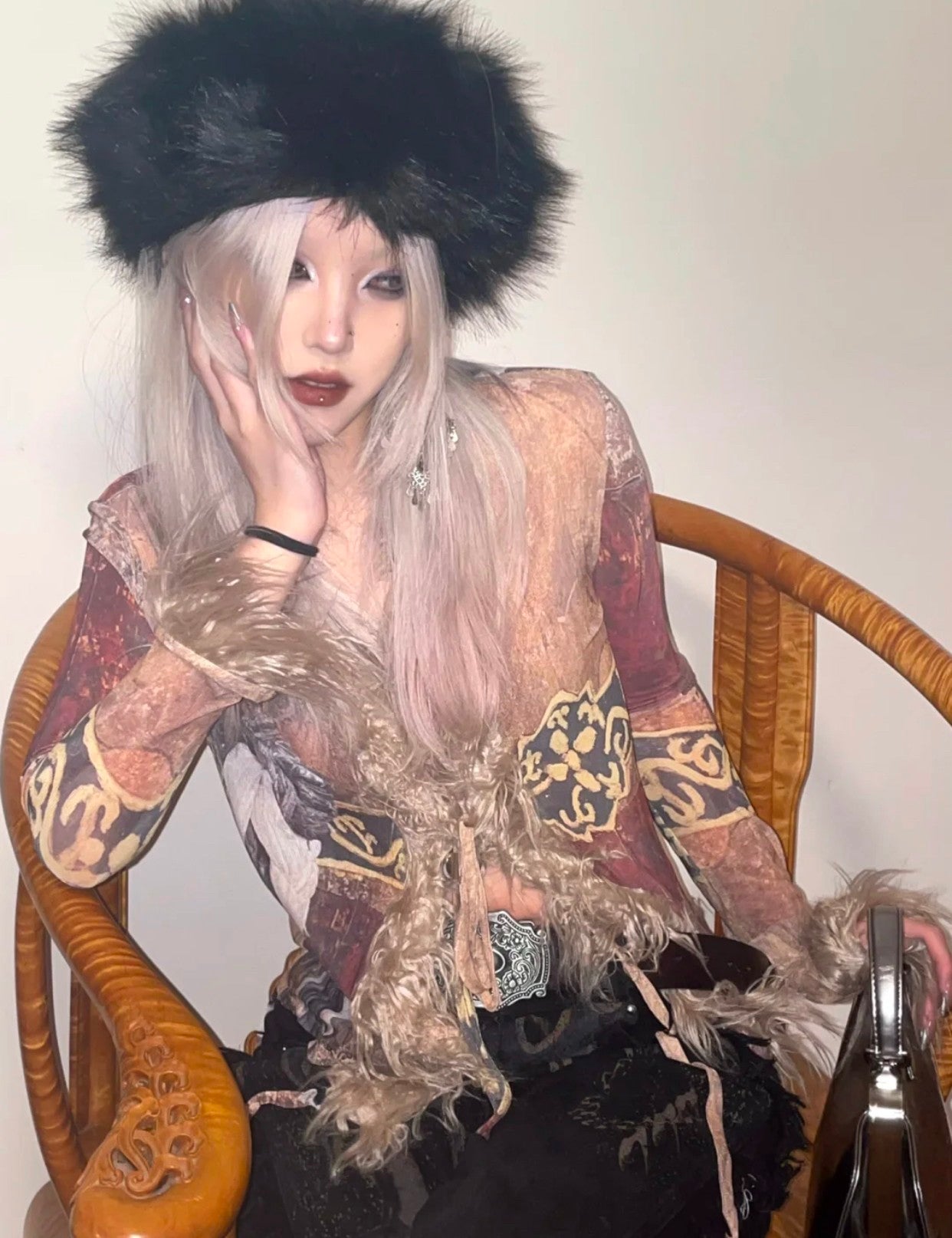 Shaggy Fur Trim: One of the standout features of this blouse is the shaggy fur trim that adorns the edges. It adds a touch of texture to the garment, creating an eye-catching contrast against the airy mesh fabric.